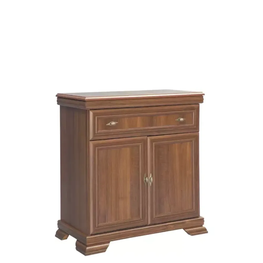 Komoda KOLONIA to propozycja wykonana w klasycznej oraz ponadczasowej stylistyce dzięki której wygląda bardzo elegancko. Komoda posiada szufladę u góry na drobne akcesoria oraz parę drzwi u dołu, za którymi znajduje się półka. Dodatkowo uchwyty komody zostały wykonane z metalu w kolorze złota.