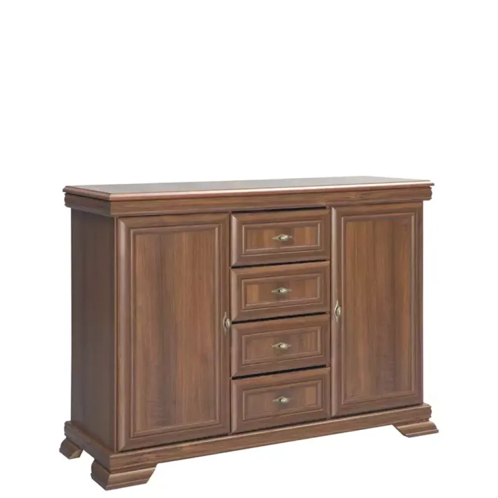 Komoda KOLONIA to propozycja wykonana w ponadczasowej i eleganckiej klasycznej stylistyce. Została wyposażona w drzwi po prawej oraz lewej stronie i cztery szuflady w swojej centralnej części. Uchwyty komody wykonano z metalu w kolorze złota, co dodatkowo uszlachetnia konstrukcję.