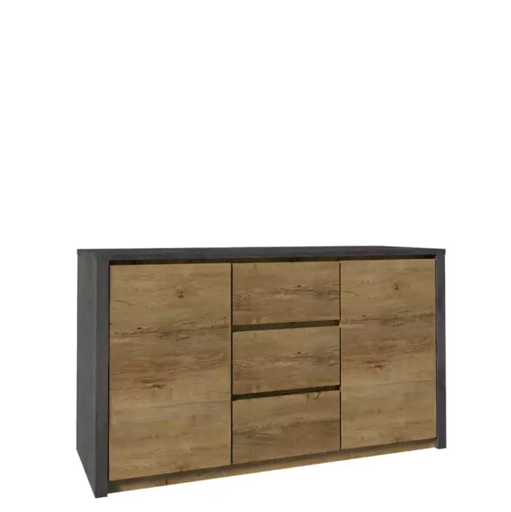 - Komoda MERIZO posiada 140 cm szerokości oraz drzwi po prawej i lewej stronie, gdzie za każdymi z nich znajdziesz półkę. Dodatkowo trzy szuflady w centralnej części mebla zagwarantują ci dodatkowe miejsce na rozmaite akcesoria oraz garderobę.