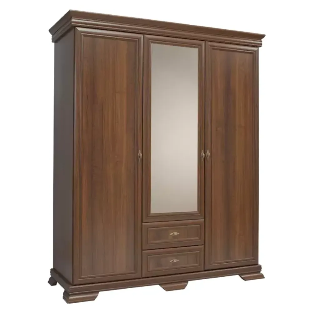 Szafa KOLONIA to propozycja wykonana w ponadczasowej oraz eleganckiej klasycznej stylistyce. Szafa posiada drzwi po lewej i prawej stronie, a za każdymi z nich swoje miejsce znalazł drążek na wieszaki. Natomiast w centralnej części szafy swoje miejsce znalazły dwie półki za drzwiami z lustrem oraz dwie szuflady u dołu.