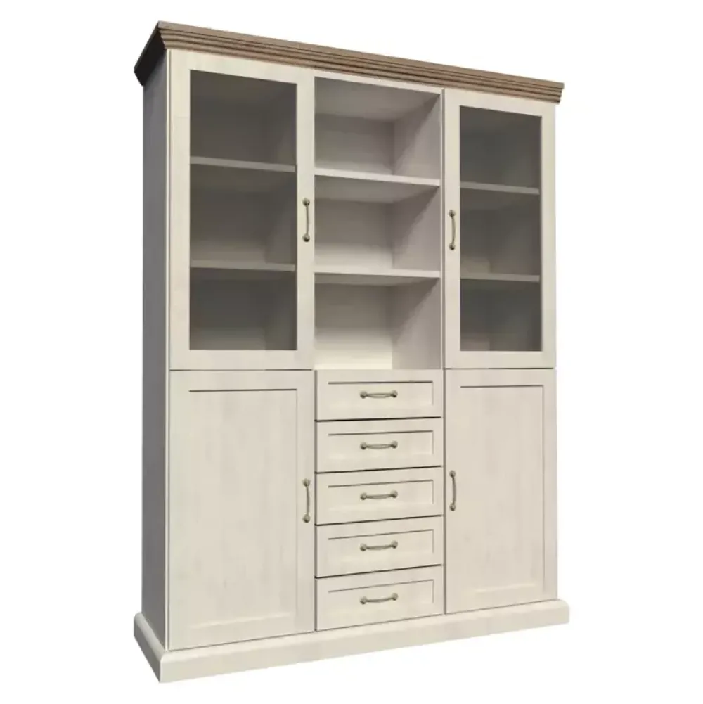 Witryna ROZANO jest ponadczasową oraz wyjątkową propozycją, która wykonana została w stylu prowansalskim. Witryna posiada szafkę po lewej oraz prawej stronie, za każdą z nich znajduje się półka. Natomiast w centralnej części witryny miejsce znalazło pięć szuflad. W górnej części witryny swoje miejsce znalazły przeszklone drzwi po lewej i prawej stronie, za którymi znajdują się dwie półki na porcelanę, w środkowej części znalazły miejsce dwie półki na dekory.