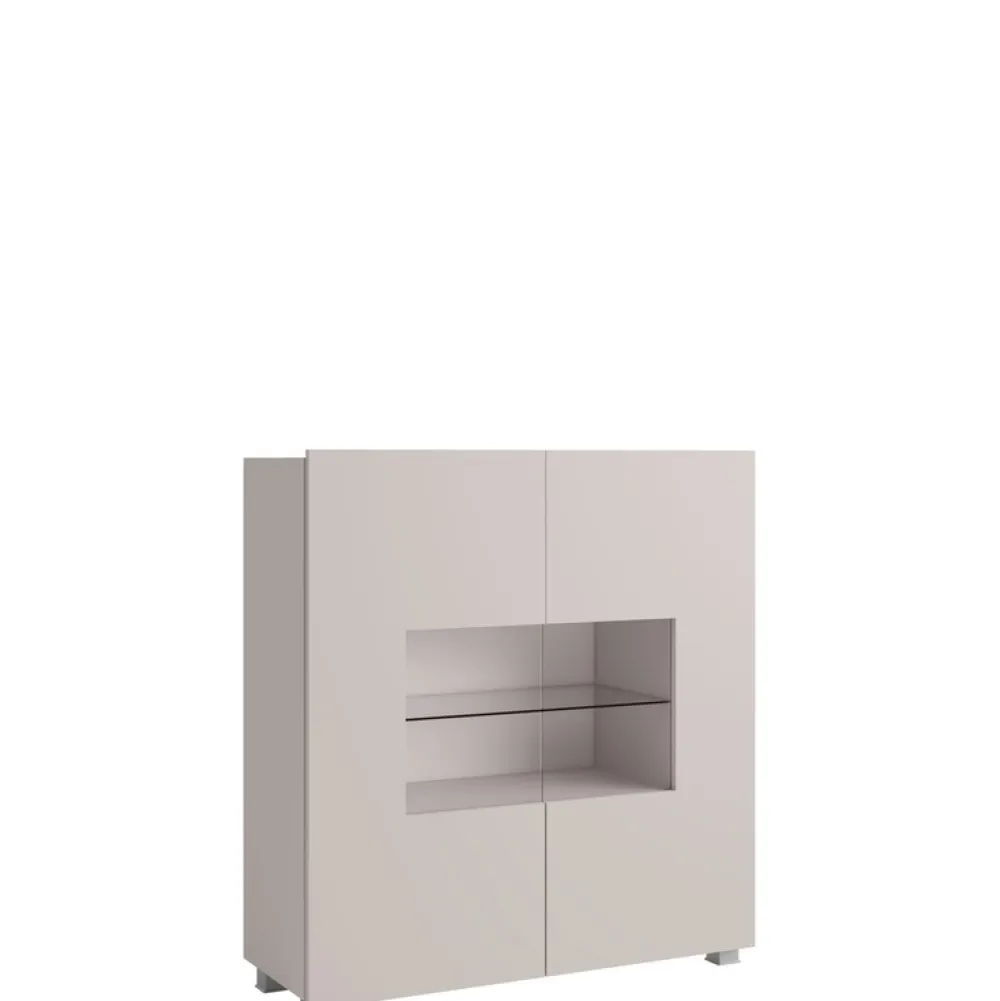- Komoda 100 cm w kolorze kaszmir z witryną i szklaną półką. Wykonana z płyty laminowanej, z trwałymi obrzeżami ABS/PCV i funkcjonalnymi frontami bez uchwytów. Idealna do salonu lub sypialni.