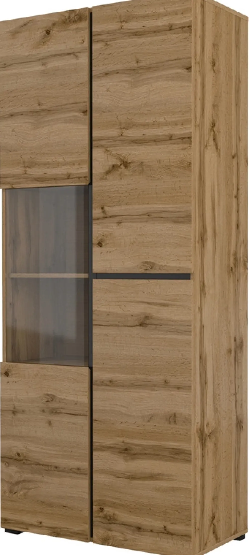 - Witryna 80 cm z sześcioma półkami po prawej i przeszklonymi drzwiami po lewej to połączenie funkcjonalności i stylu. Wykonana z płyty laminowanej 15 mm, z obrzeżami ABS, świetnie sprawdzi się w nowoczesnym wnętrzu.