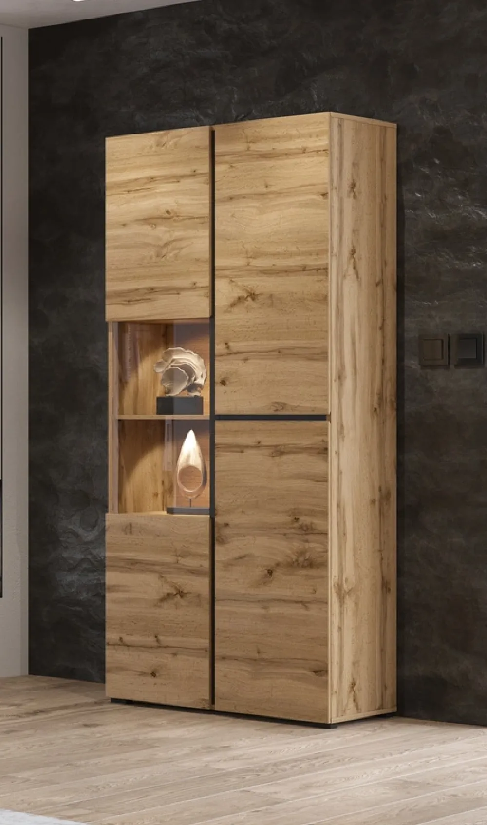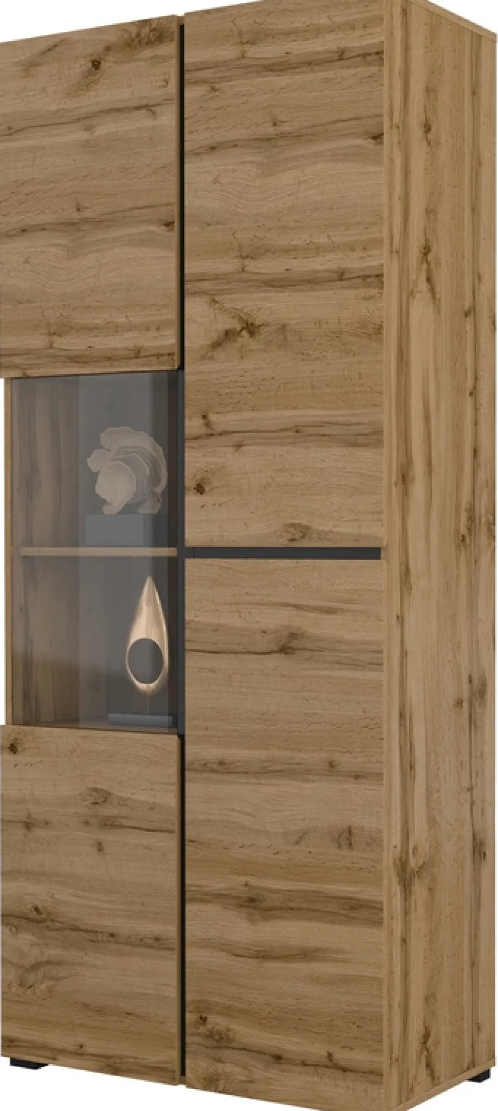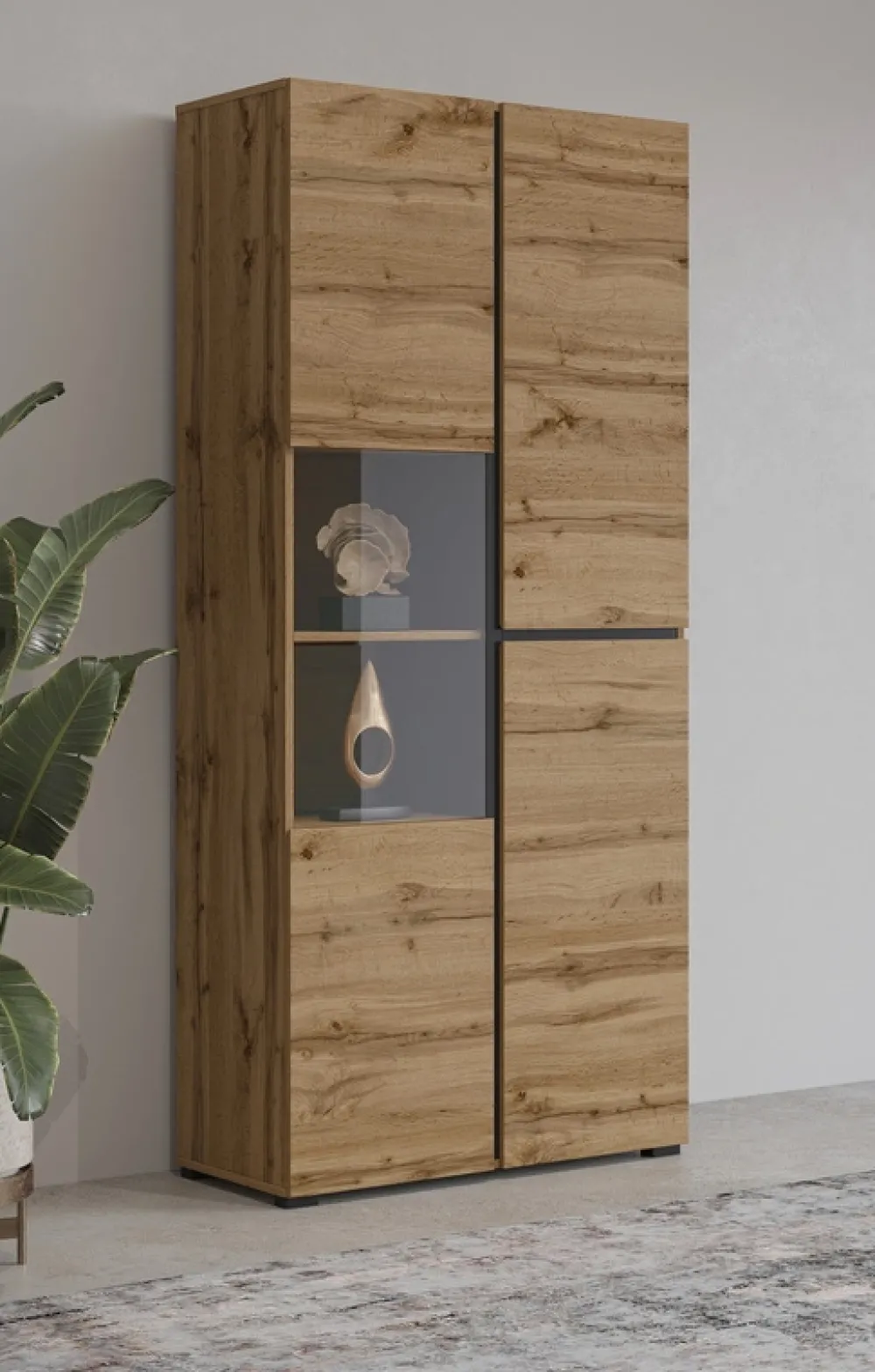 Witryna łączy w sobie estetykę i praktyczne rozwiązania, które pomogą Ci utrzymać porządek i stworzyć przytulną atmosferę w salonie, jadalni czy gabinecie. Przeszklenie nadaje lekkości, a zamknięte półki ukryją wszystko, co chcesz zachować tylko dla siebie.