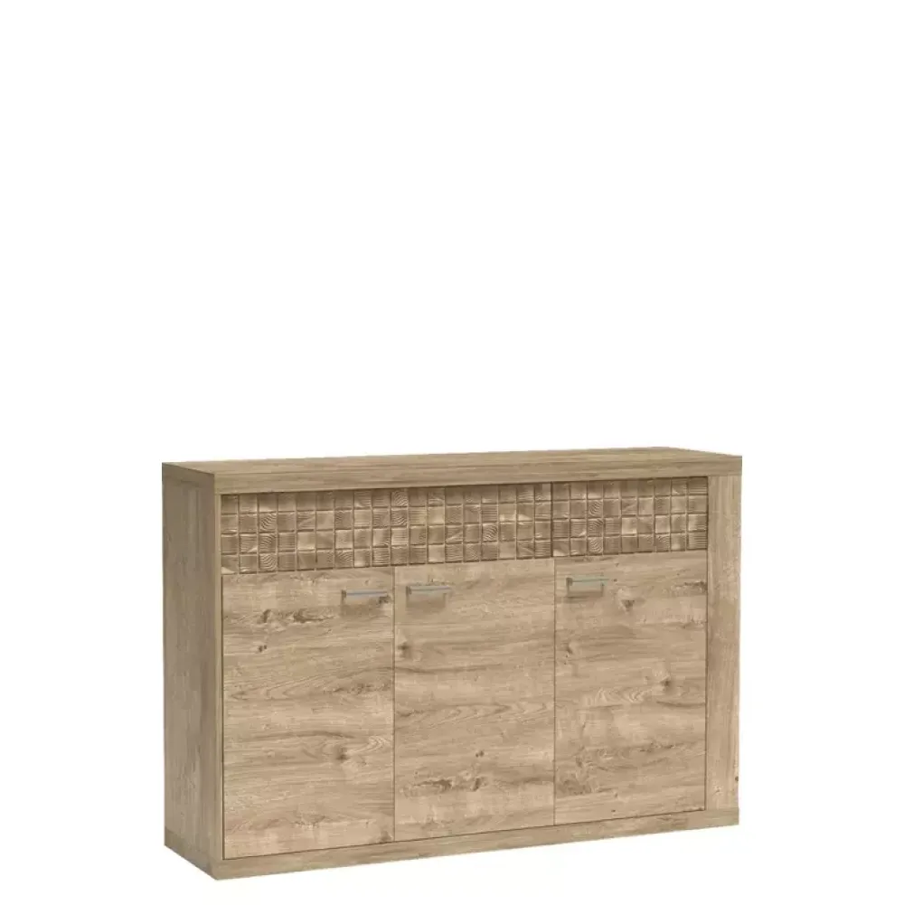 - Komoda NORIENTE to bardzo pojemna propozycja, która doskonale sprawdzi się jako miejsce na garderobę oraz rozmaite akcesoria. Komoda posiada troje drzwi. Lewe oraz centralne drzwi tworzą szafkę z półką, natomiast prawe kryją za sobą półkę.