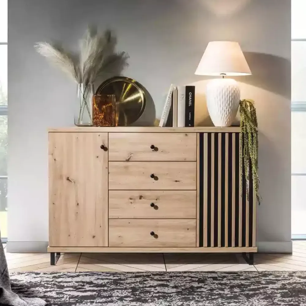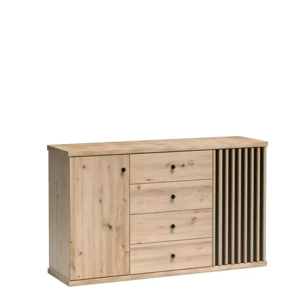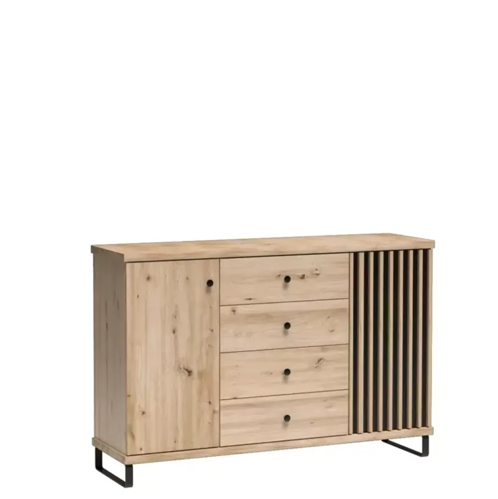 Komoda CALIS jest propozycją, która dzięki swojej niebanalnej stylistyce doskonale odnajduje się we współczesnych aranżacjach pomieszczeń. Komoda została wyposażona w cztery szuflady oraz parę drzwi, za każdymi z nich znajduje się półka. Komoda dzięki odpowiedzialnemu zagospodarowaniu przestrzeni oraz estetycznym wykonaniu sprawdzi się zarówno w sypialni, jak i salonie.