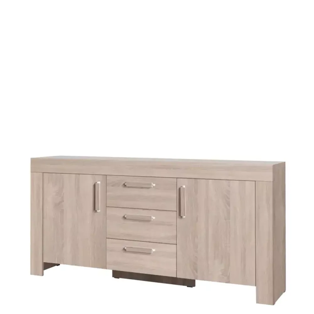 - Komoda wyposażona w trzy szuflady na prowadnicach rolkowych oraz dwie pary drzwiczek uchylnych, za którymi znajdują się półki. Komoda o szerokości 170 cm.