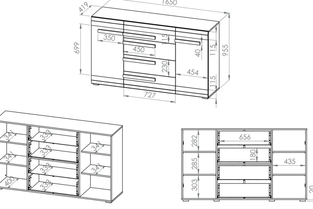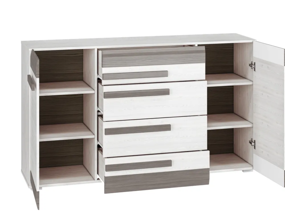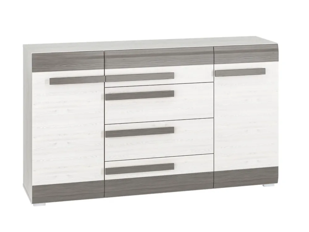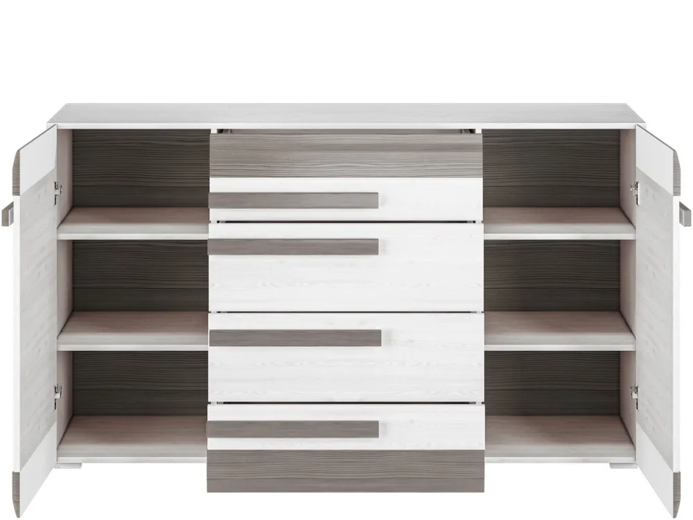 - Komoda 165 cm BLANCO posiada drzwi po prawej i lewej stronie, za każdymi z nich znajdują się dwie półki. W centralnej części mebla swoje miejsce znalazły cztery pojemne szuflady osadzone na prowadnicach rolkowych. Obrzeża wykończone okleiną ABS.