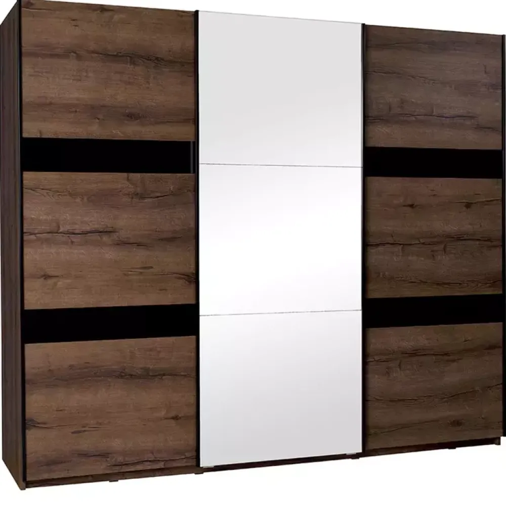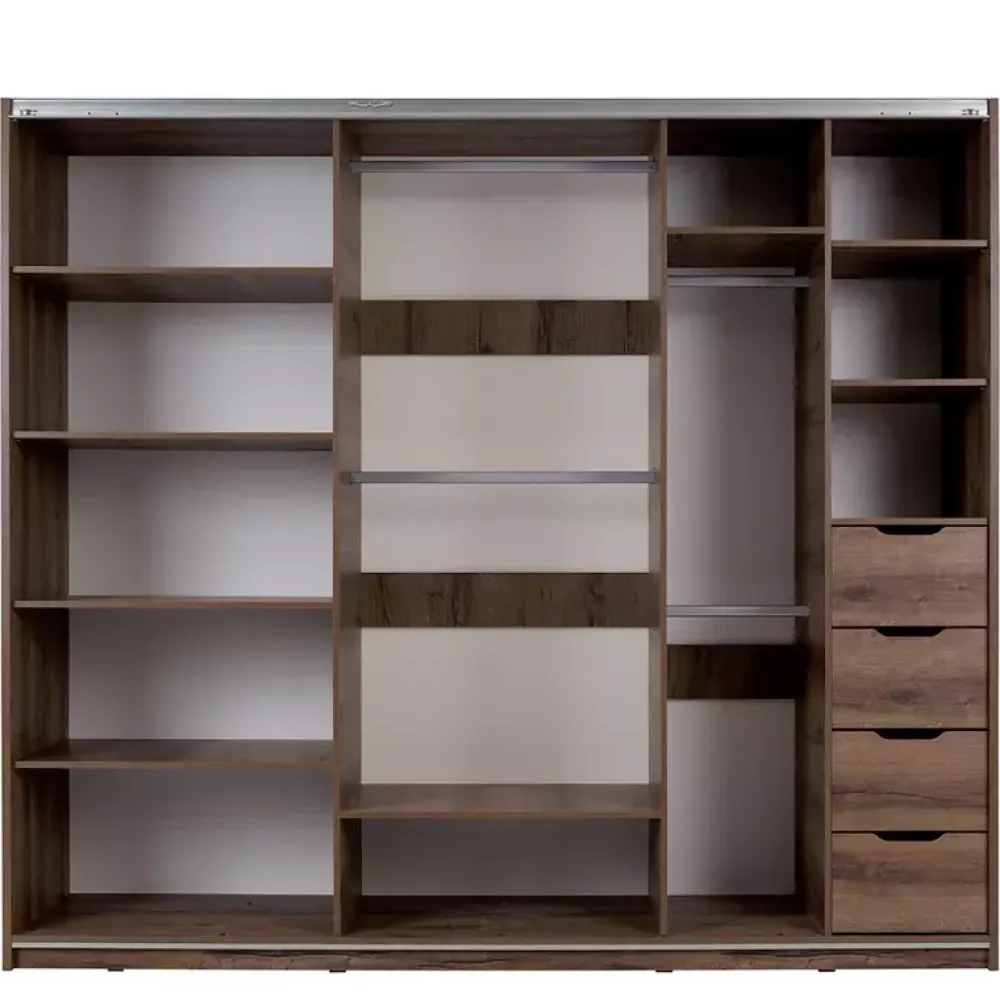 - Szafa przesuwna 250 cm z lustrem posiada cztery półki po lewej stronie, dwa drążki i półkę pod nimi w środkowej części oraz dwa drążki i półkę nad nimi, trzy półki i cztery szuflady po prawej stronie.