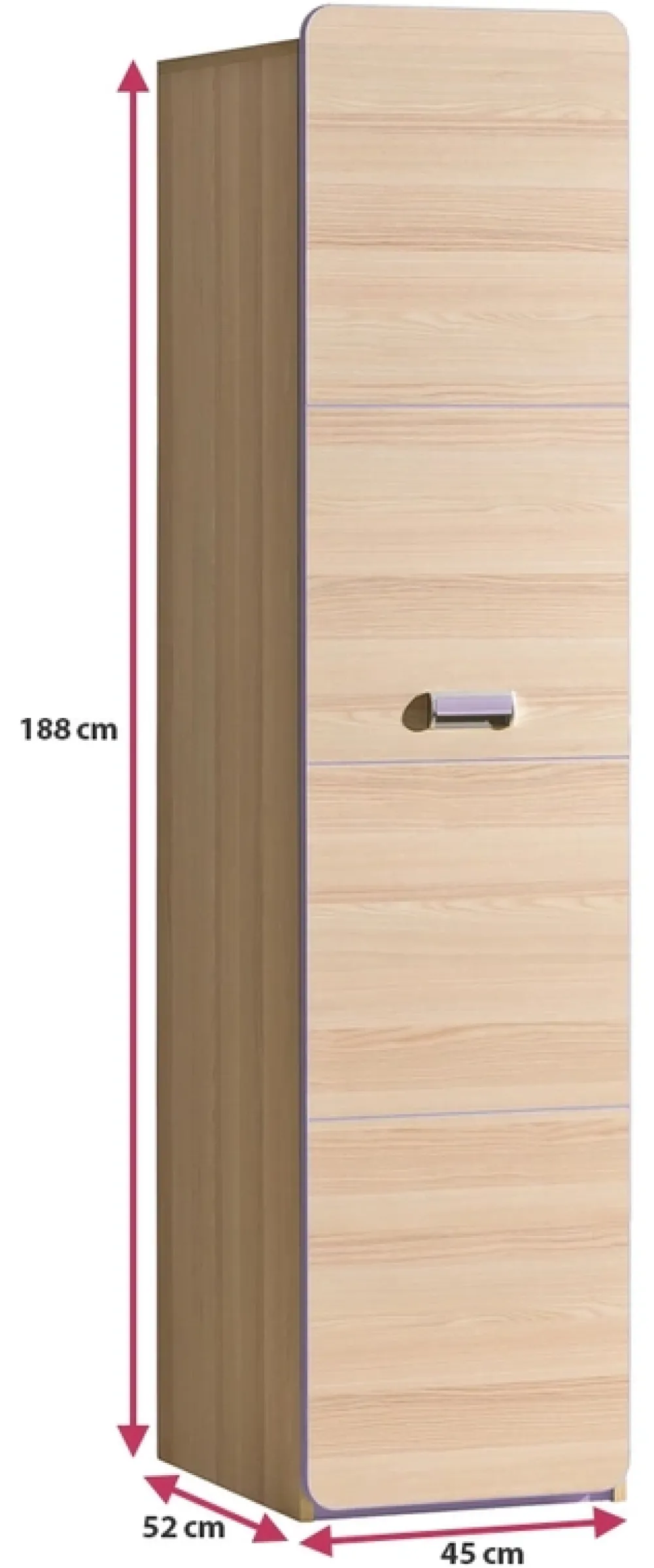 Wymiary szafy zostały starannie przemyślane, aby zapewnić optymalne wykorzystanie przestrzeni, przy zachowaniu kompaktowych rozmiarów. Szerokość 45 cm, wysokość 188 cm i głębokość 52 cm tworzą idealną równowagę między pojemnością a zajmowanym miejscem, co sprawia, że szafa doskonale wpasuje się nawet w mniejsze pomieszczenia.