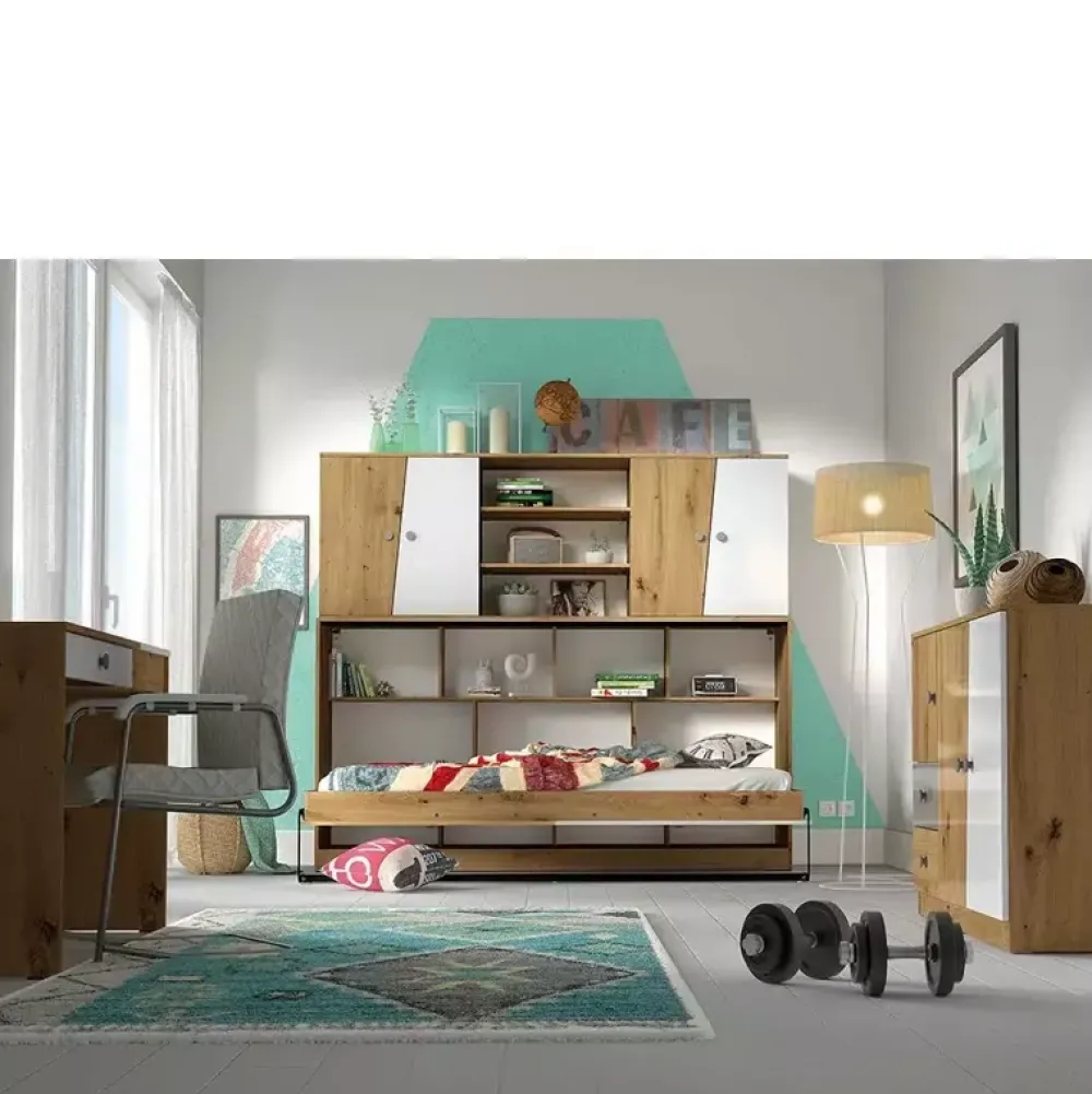 Zestaw zawiera praktyczny półkotapczan, dzięki któremu w mniejszych pomieszczeniach zyskujemy dużo miejsca z racji jego funkcji składania, czyniących go zarówno łóżkiem, jak i szafą zdobiącą nasze pomieszczenie. Uzupełnieniem półkotapczanu jest jego nadstawka, klasyczna nowoczesna i praktyczna, nadstawka zawiera czworo drzwi, dzięki którym ukryjemy akcesoria, których nie chcemy mieć wyciągniętych na wierzch, do ekspozycji naszych książek, pamiątek i rozmaitych akcesoriów służą dwie półki i wnęka. Komoda, która znalazła miejsce w zestawie MONACO, posiada dwie szuflady oraz twoje drzwi, dzięki niej możemy w stylowy i praktyczny sposób przechowywać nasze ubrania.