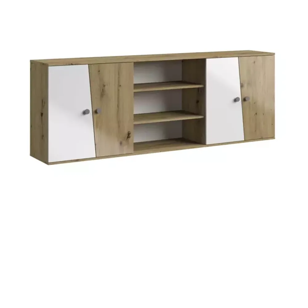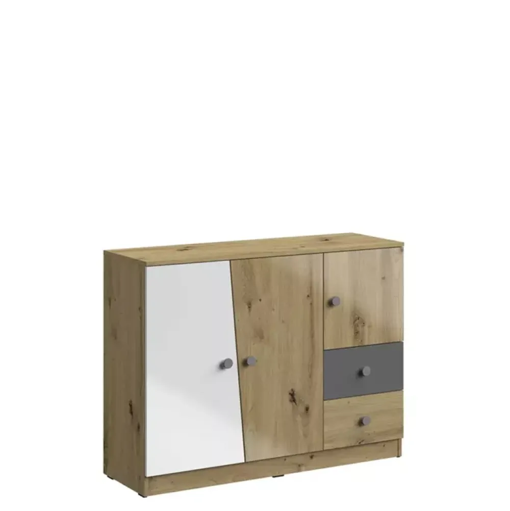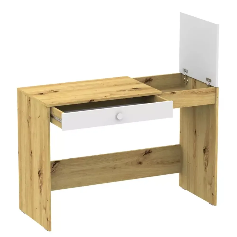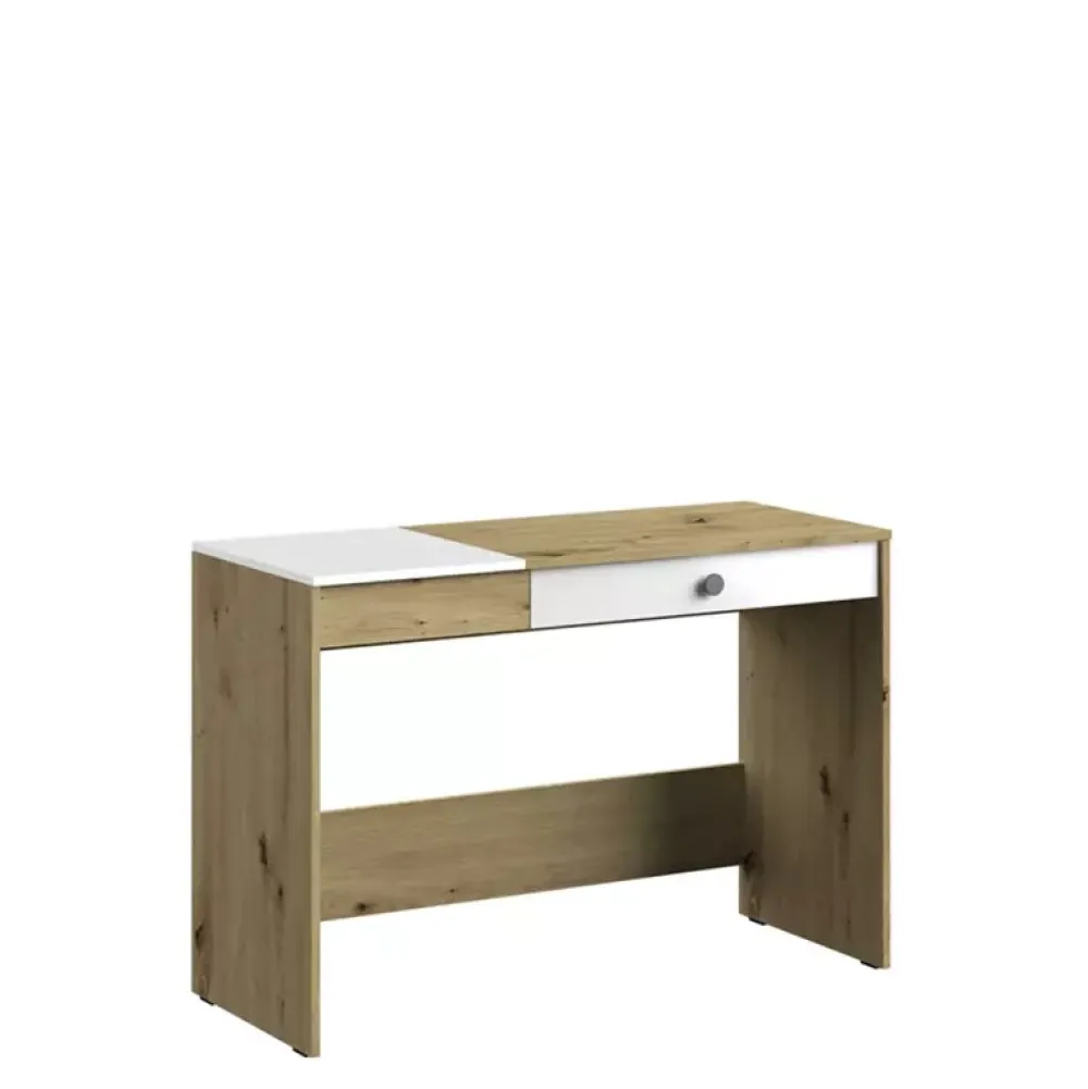 - Meble do pokoi młodzieżowych w kolorze Dąb Artisan z kolekcji MONACO. Zestaw zawiera biurko ze schowkiem w blacie i szufladą, półkotapczanem poziomym, nadstawką półkotapczanu z czterema drzwiami i półkami otwartymi na akcesoria oraz komodę z szufladami.