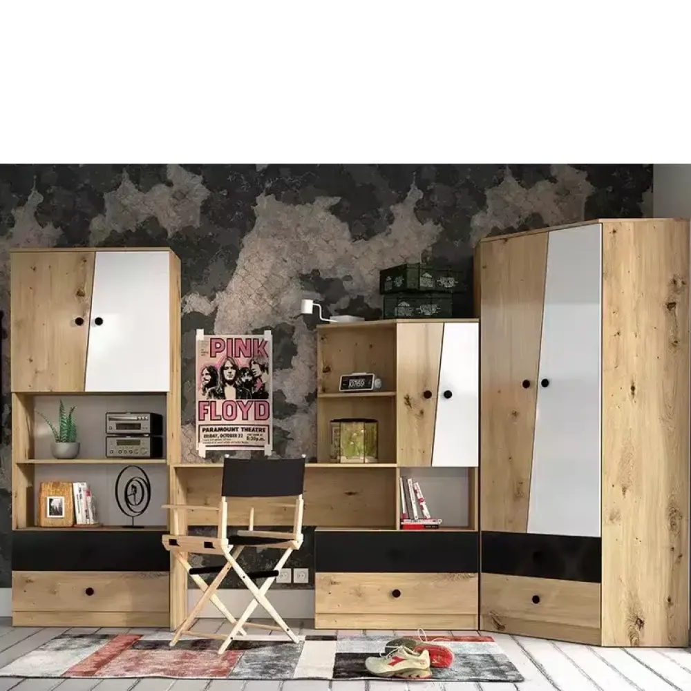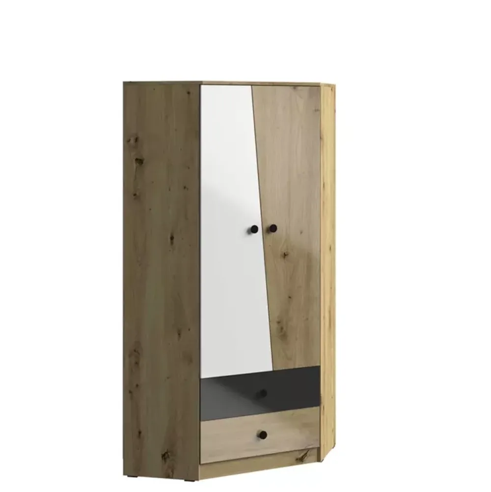 Zestaw mebli pokojowych w kolorze Dąb Artisan kolekcji MONACO jest sposobem na stylowe umeblowanie pokoju młodzieżowego. W skład zestawu chodzi szafa narożna z obszerną przestrzenią na wieszaki, trzema półkami, wnęką, oraz dwiema pojemnymi szufladami. Biurko z regałem po prawej stronie, stanowi praktyczne rozwiązanie dla osób ceniących swobodę oraz łatwy dostęp do akcesoriów biurkowych, czy stylowego eksponowania ich na regale. Regał z trzema półkami i dwoma szufladami stanowi uzupełnienie zestawu, półka oraz otwarta wnęka stanowi idealne rozwiązanie dla ekspozycji akcesoriów i pamiątek, dwie szuflady czekają na twoje rzeczy, a przestrzeń za drzwiami, w których zagospodarowane zostały dwie półki stanowi uzupełnienie praktycznej całości. Z zestawu zadowoleni będą zarówno rodzice, jak i młodzież.