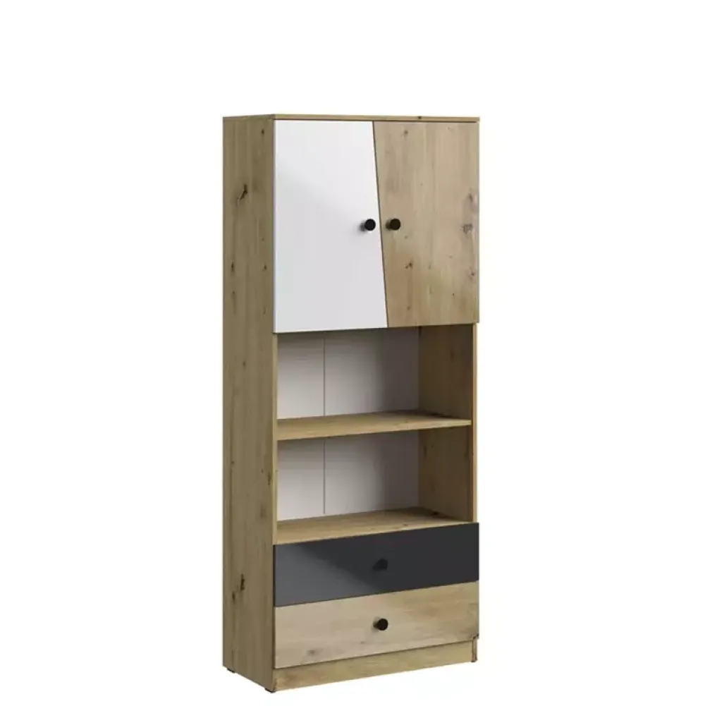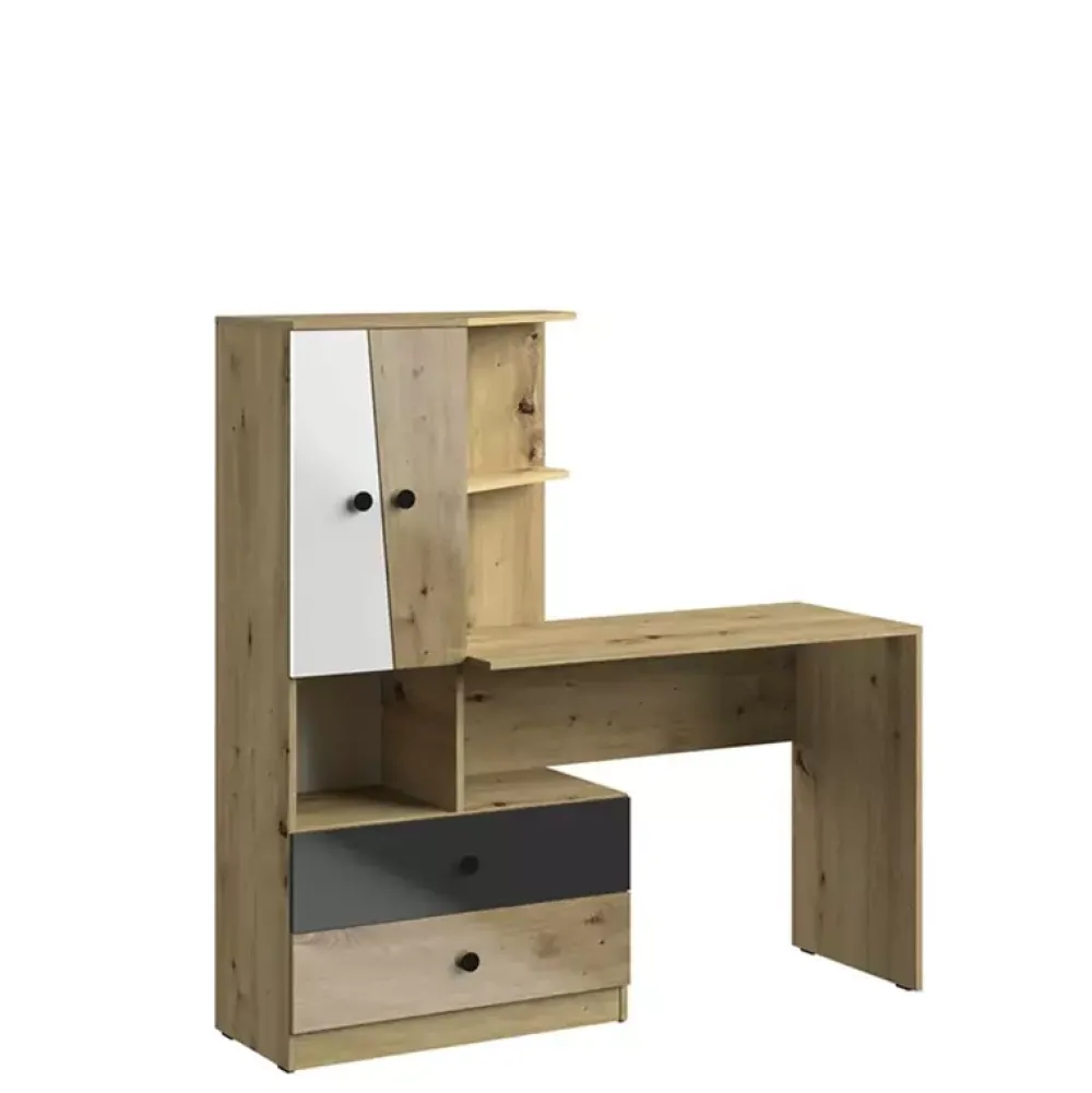 - Zestaw nowoczesnych pokojowych w kolorze Dąb Artisan z kolekcji MONACO. Zestaw został skompletowany z praktycznego biurka z regałem, szafy narożnej z dwoma szufladami oraz regału z trzema półkami i dwoma szufladami.