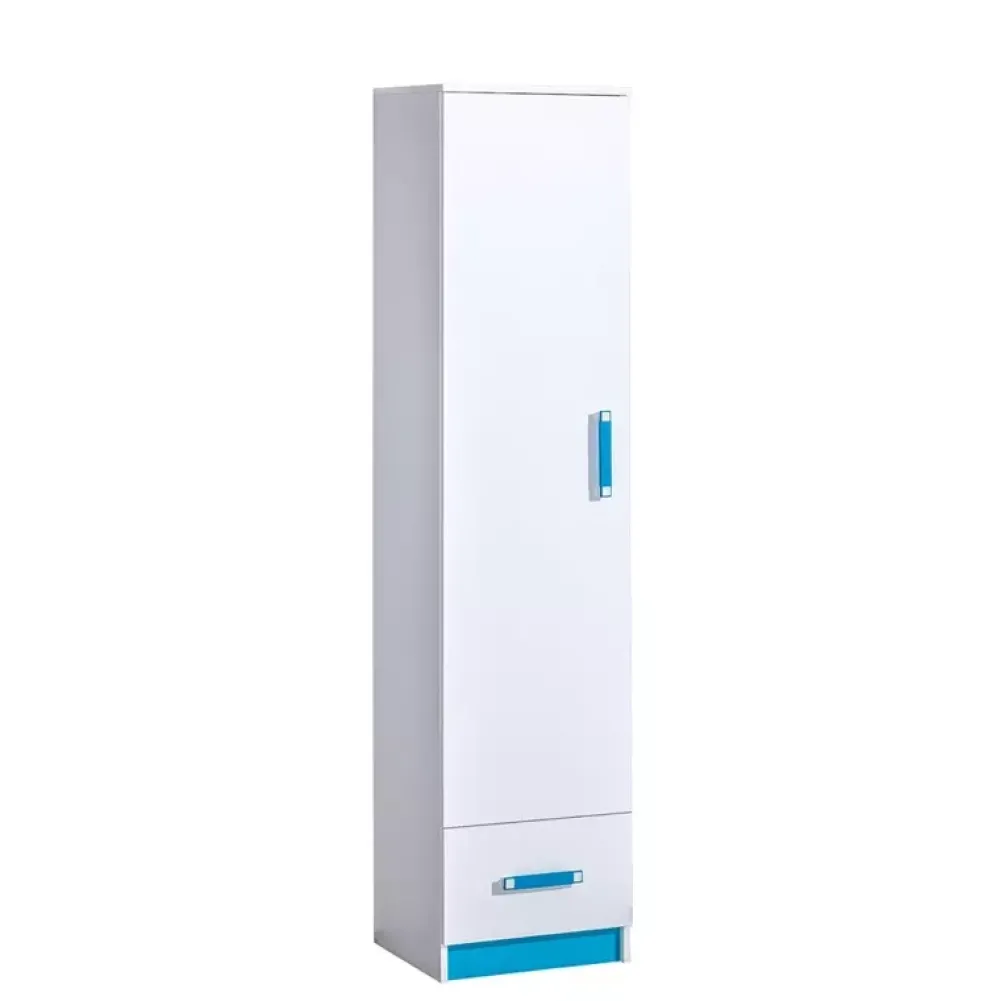 Regał z kolekcji młodzieżowych mebli systemowych TRAFIKO. Regał został wyposażony w szufladę oraz trzy półki zamknięte drzwiami. Regał idealnie sprawdzi się jako miejsce na twoje ubrania. Dzięki licznym półkom zyskasz porządek w regale. Dzięki trzem opcjom kolorystycznym dodatków i uchwytów dopasujesz regał do swojego pomieszczenia.