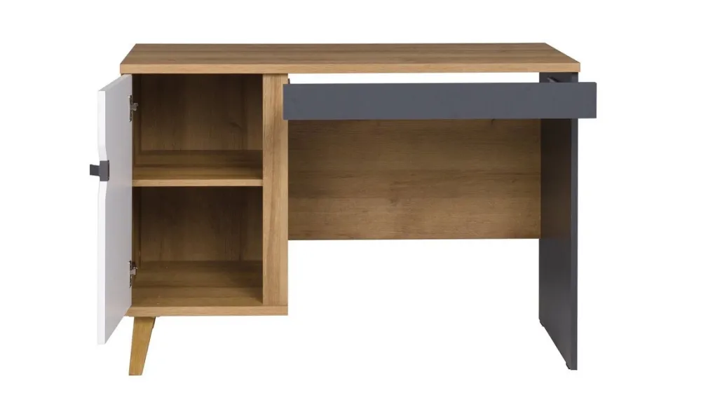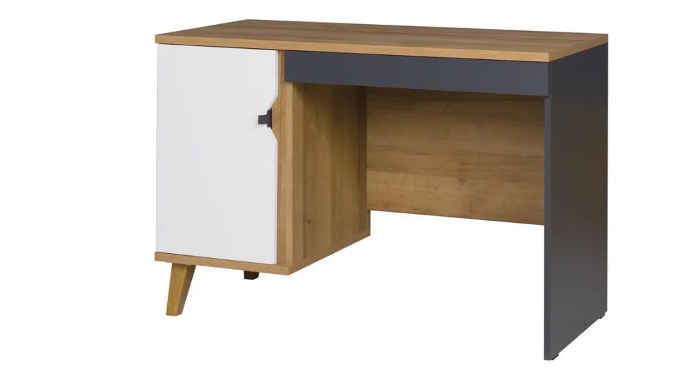 szer. 94,5 cm, wys. 90 cm, gł. 204,5 cm - Skandynawskie biurko z kolekcji MERKURY, wyposażone w szufladę oraz zamykaną szafkę, w której kryje się jedna półka. Biurko ma elementy w kolorach biały i grafit;