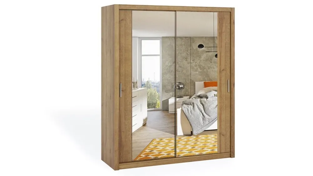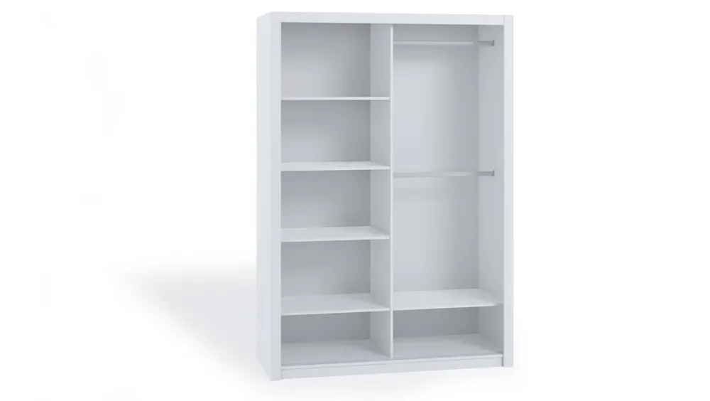 szer. 110 cm, wys. 70 cm, gł. 50 cm - Dwudrzwiowa szafa przesuwna z kolekcji BELLA, szafa z lustrem, po prawej stronie znajdują się dwa drążki na wieszaki oraz półeczka u dołu, a po lewej stronie cztery półki;