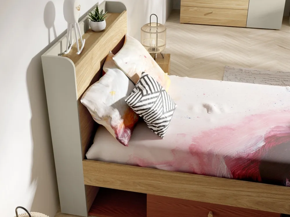 Centralnym elementem zestawu jest łóżko ze stelażem o wymiarach 90×200 cm. Solidna konstrukcja zapewnia stabilność i bezpieczeństwo, a ergonomiczny design gwarantuje wygodny sen. Stelaż wykonany z wysokiej jakości materiałów dodatkowo wspiera materac, przedłużając jego żywotność i zapewniając zdrowy wypoczynek każdej nocy.