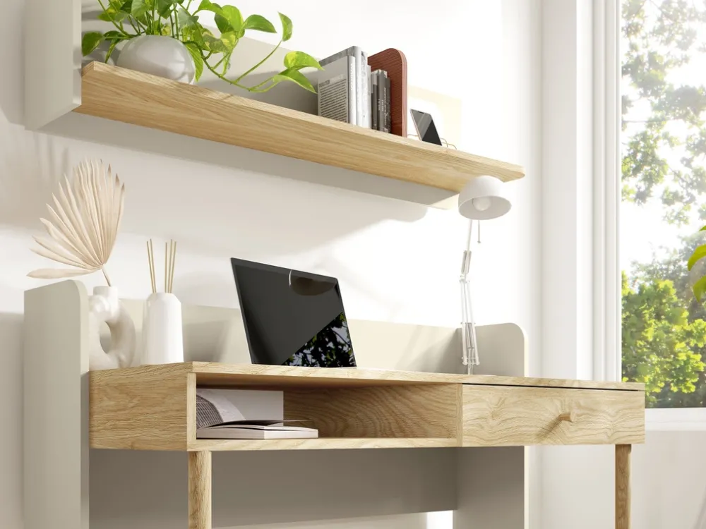 Biurko z szufladą pod blatem to idealne miejsce do nauki i pracy twórczej. Szeroki blat zapewnia wystarczającą przestrzeń na komputer, książki i materiały szkolne, a praktyczna szuflada pod blatem jest idealna do przechowywania przyborów szkolnych, notatek czy innych niezbędnych drobiazgów. Ergonomiczna wysokość biurka zapewnia komfort pracy, a jego nowoczesny wygląd dodaje uroku każdemu pokojowi.