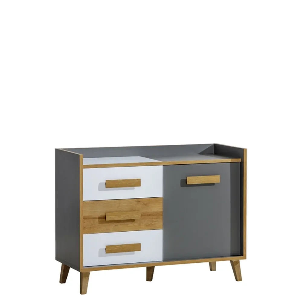 - Komoda młodzieżowa WARSAW została wyposażona w trzy pojemne szuflady osadzone na prowadnicach kulkowych, obok których po prawej stronie swoje miejsce znalazły drzwi, a za nimi praktyczna półka. Komoda posiada nóżki o wysokości 15 cm.