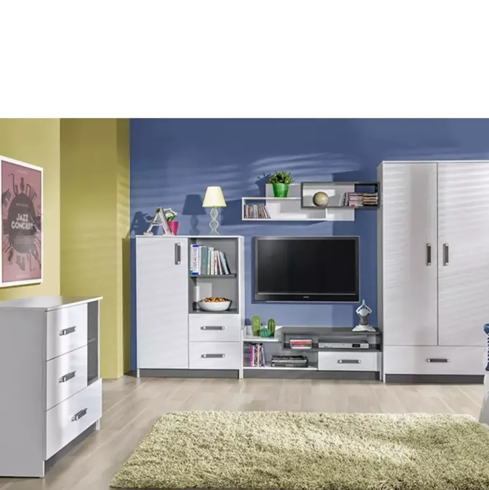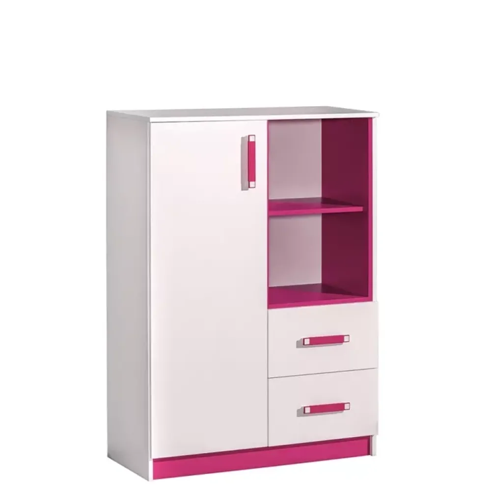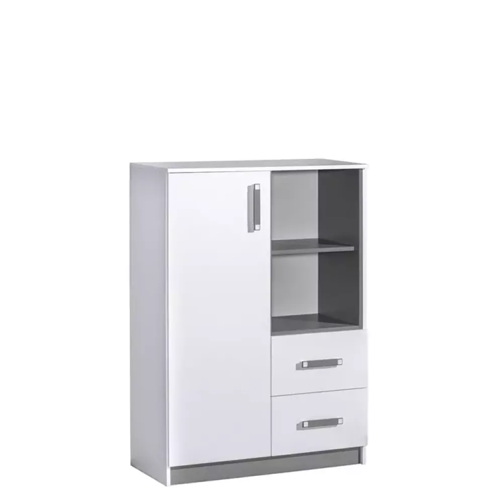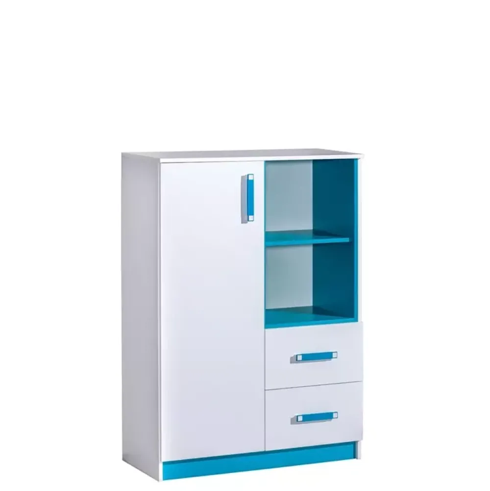 Komoda wysoka z kolekcji młodzieżowych mebli systemowych TRAFIKO. Komoda została wyposażona we dwie pojemne szuflady oraz trzy półki, jedną otwartą przeznaczoną do eksponowania akcesoriów, oraz dwie zamknięte, w których można zagospodarować ubrania. Dzięki trzem wariantom kolorystycznym dopasujesz komodę do swojego pomieszczenia.