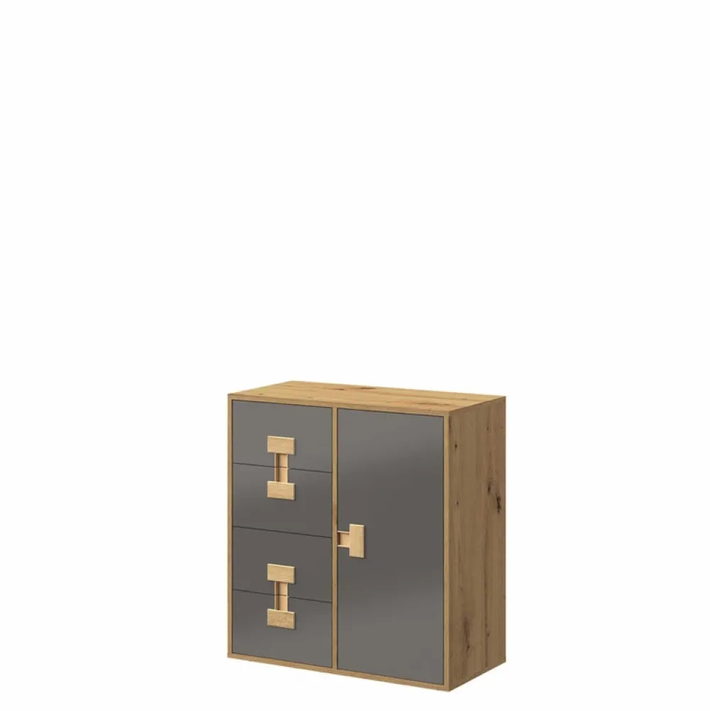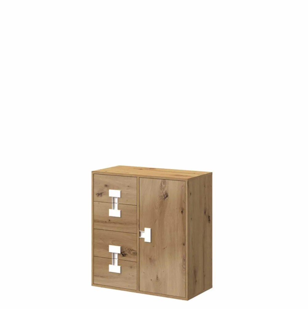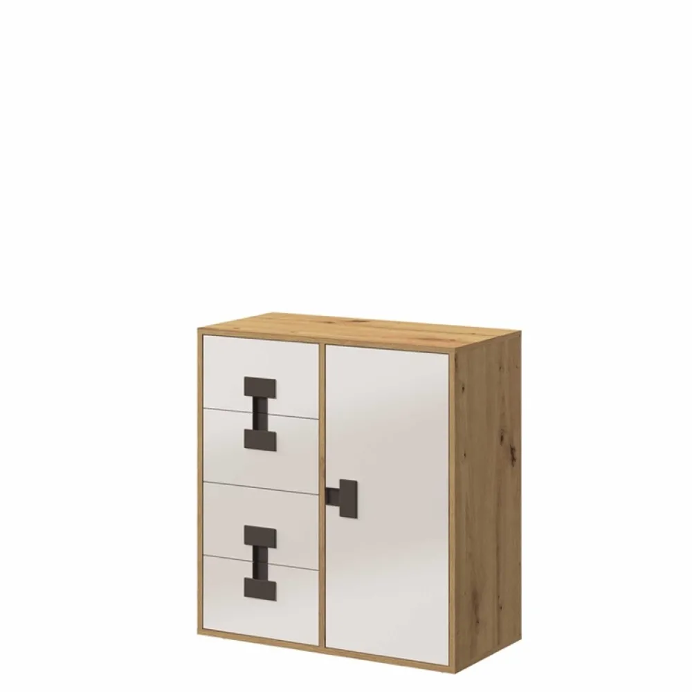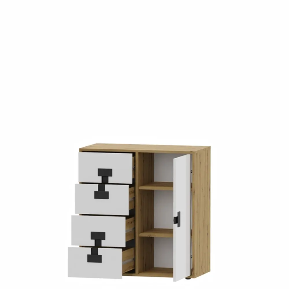 - Młodzieżowa komoda z szufladami w kolorze Dąb Artisan z kolekcji INDEX. Młodzieżową komodę z szufladami wyposażono w cztery szuflady oraz parę drzwi, za którą znajdziemy trzy półki na nasze ubrania lub akcesoria.
