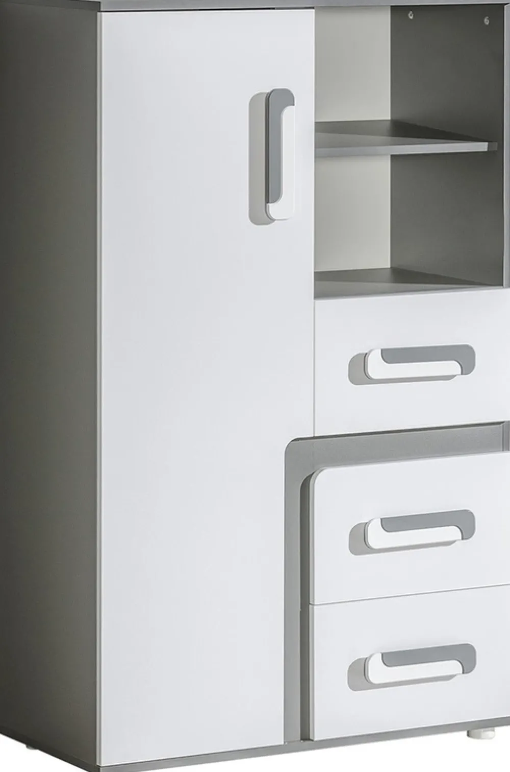 Nowoczesna komoda z kolekcji młodzieżowych mebli APETITO. Komoda posiada trzy szuflady oraz otwartą przestrzeń z półką nad nimi na akcesoria zdobiące i rozmaite dekory. Po lewej stronie znajdują się drzwi, za którymi możemy znaleźć dwie obszerne półki, dzięki czemu zyskasz wiele przestrzeni na ubrania.