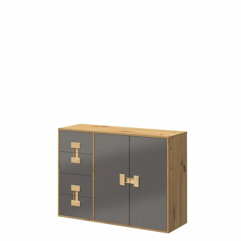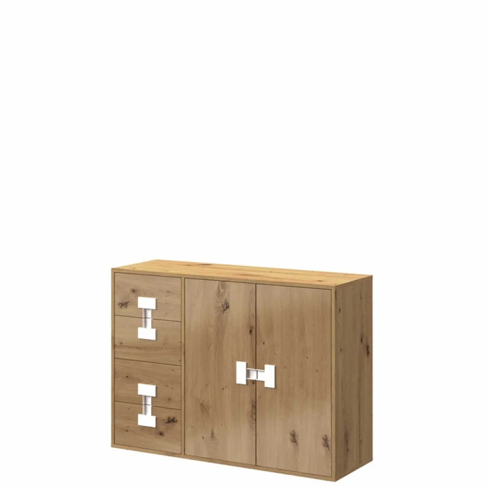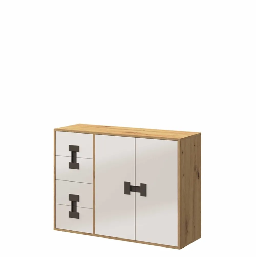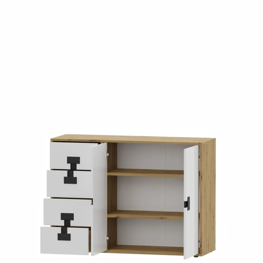 - Młodzieżowa komoda z szufladami w kolorze Dąb Artisan z kolekcji INDEX. Duża Młodzieżowa komoda ma 118 cm szerokości i została wyposażona w cztery szuflady oraz trzy półki schowane za drzwiami.