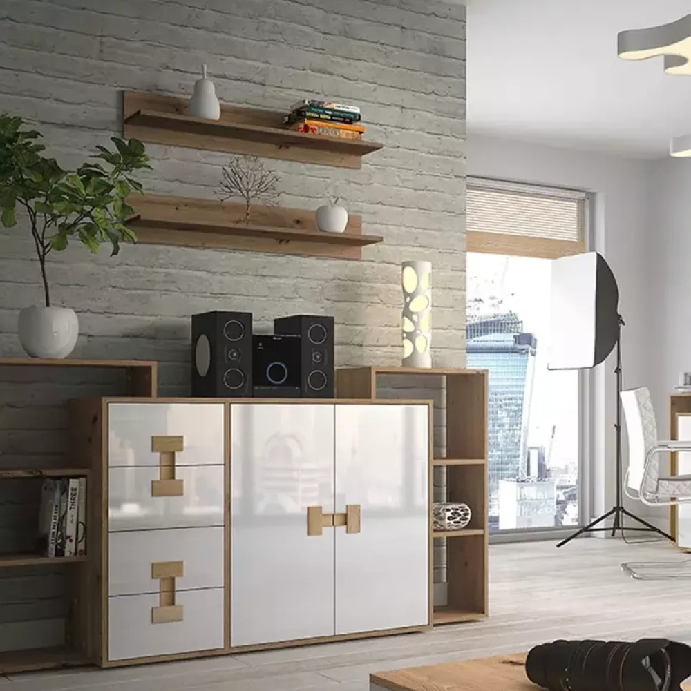 - Korpus oraz fronty wykonane zostały z laminowanej płyty o grubości 16 mm, o wykończeniu w wysokim połysku.