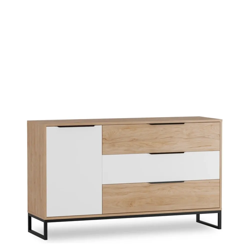 - Komoda na nóżkach w formie płoz z kolekcji LORRO to świetna propozycja do pokoju nastolatka. Młodzieżowa komoda zachowana jest w ciekawej kolorystyce dębu hikora połączonego z białym matem. Posiada metalowe uchwyty oraz prowadnice kulkowe.