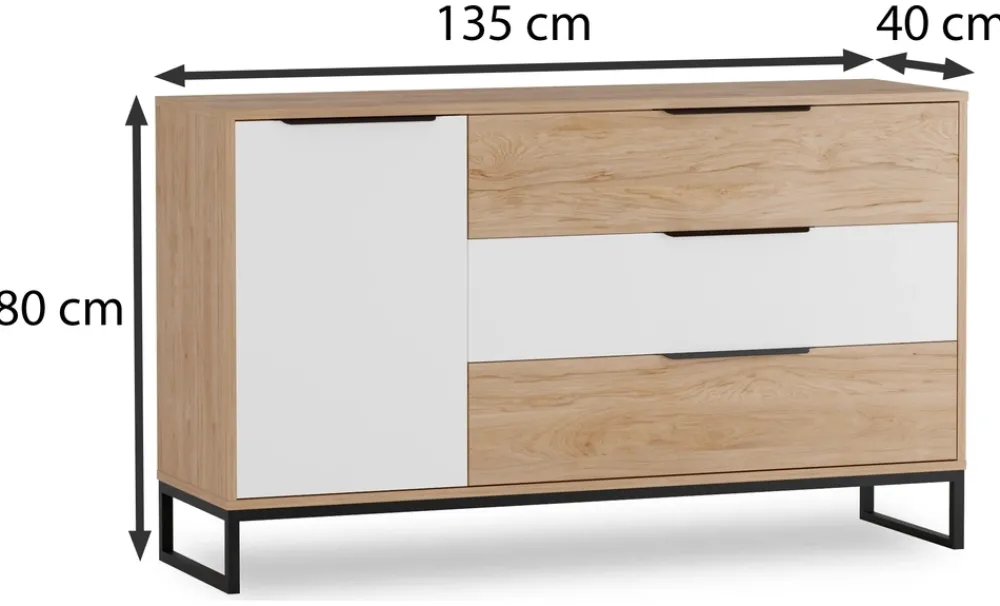 Komoda z szufladami LORRO zaskoczy Cię ciepłym kolorem dębu hikora połączonym ze stylowym białym matem. Kolory te są modne i z łatwością wpasują się w różne aranżacje.