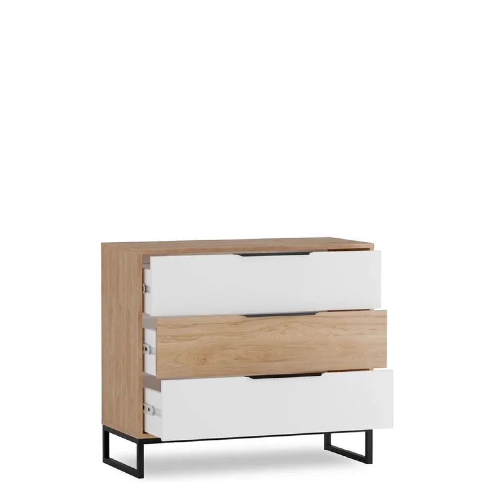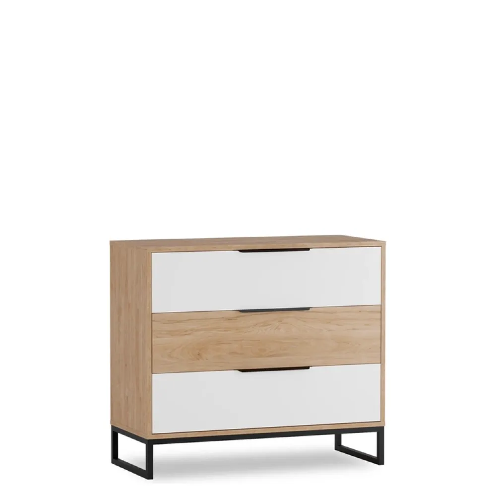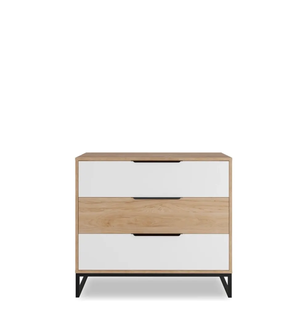 - Nowoczesna komoda z szufladami LORRO. Wyróżniają ją ciekawa kolorystka oraz wysokie metalowe nóżki w formie płoz. Obrzeża zakończone z ABS. Fronty oraz korpusy wykonane są z płyty laminowanej o grubości 16 mm. Uchwyty z metalu.