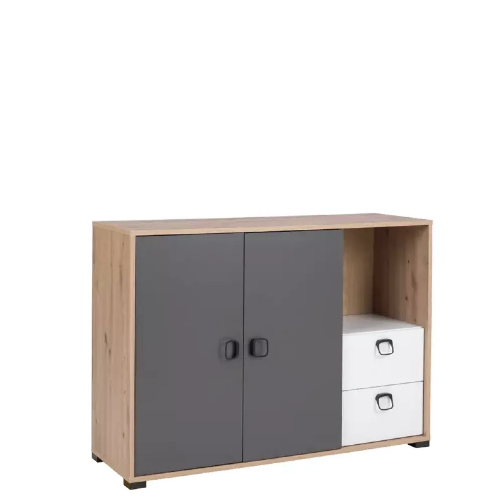Komoda młodzieżowa CAMERUN łączy nowoczesną stylistykę z funkcjonalnością – doskonałe uzupełnienie każdego pokoju młodzieżowego. Ta komoda do pokoju młodzieżowego została zaprojektowana z myślą o potrzebach współczesnej młodzieży, oferując im stylowe i praktyczne miejsce do przechowywania ubrań oraz innych przedmiotów. Komoda z szufladami posiada dwoje drzwi, za którymi znajduje się przestronna półka, za którymi można umieścić przedmioty takie jak pościel, ręczniki czy rzeczy sezonowe. Dzięki drzwiom, te elementy będą ukryte przed wzrokiem gości, co pozwoli utrzymać porządek i estetykę pokoju. W dolnej części komody umieszczone są dwie szuflady osadzone na prowadnicach kulkowych, które pozwolą na przechowywanie drobnych akcesoriów, takich jak bielizna czy skarpetki. Prowadnice kulkowe gwarantują płynne i ciche otwieranie oraz zamykanie szuflad, co z pewnością doceni każdy użytkownik. Obrzeża zabezpieczone ABS, zastosowane w konstrukcji komody, zapewniają jej trwałość oraz odporność na uszkodzenia mechaniczne. Ponadto, nowoczesna stylistyka sprawia, że ta młodzieżowa komoda będzie doskonale komponować się z każdym wnętrzem, dodając mu świeżości i energii. Wprowadź do swojego domu tę wyjątkową, młodzieżową komodę z szufladami, która spełni oczekiwania nawet najbardziej wymagającej młodzieży, łącząc funkcjonalność z atrakcyjnym designem.