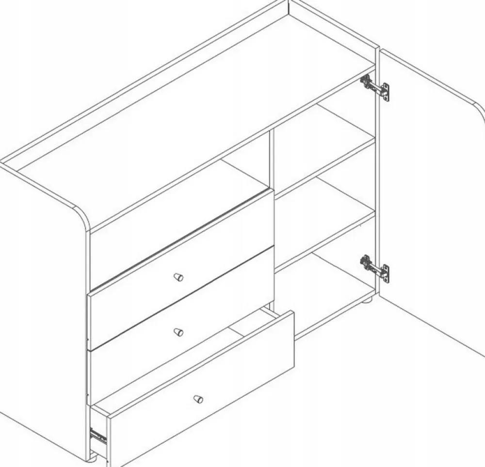 Dwie otwarte półki stanowią serce tej komody, oferując łatwy dostęp do ulubionych książek, dekoracji czy sprzętu multimedialnego. Dzięki temu każdy przedmiot ma swoje miejsce, a jednocześnie jest na wyciągnięcie ręki. To idealne rozwiązanie dla młodych ludzi, którzy lubią mieć wszystko pod kontrolą.