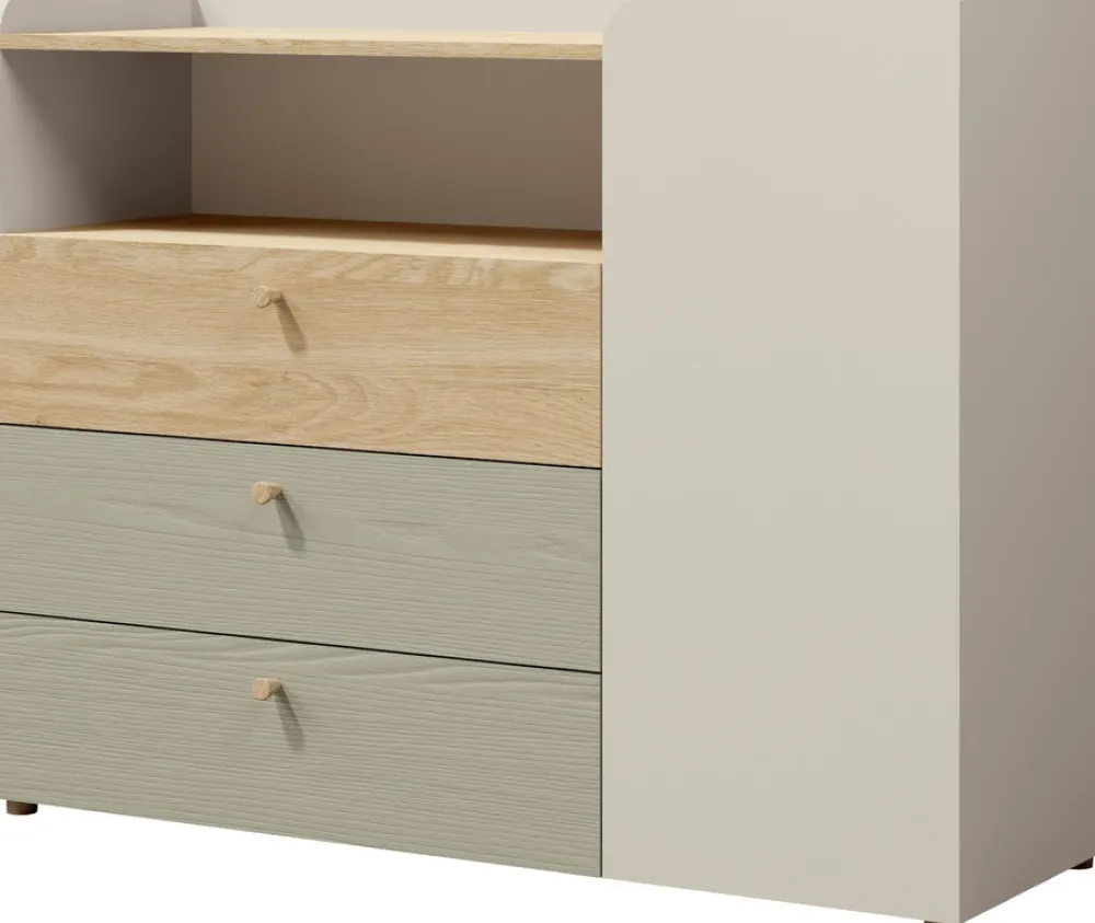 Dwie otwarte półki stanowią serce tej komody, oferując łatwy dostęp do ulubionych książek, dekoracji czy sprzętu multimedialnego. Dzięki temu każdy przedmiot ma swoje miejsce, a jednocześnie jest na wyciągnięcie ręki. To idealne rozwiązanie dla młodych ludzi, którzy lubią mieć wszystko pod kontrolą.