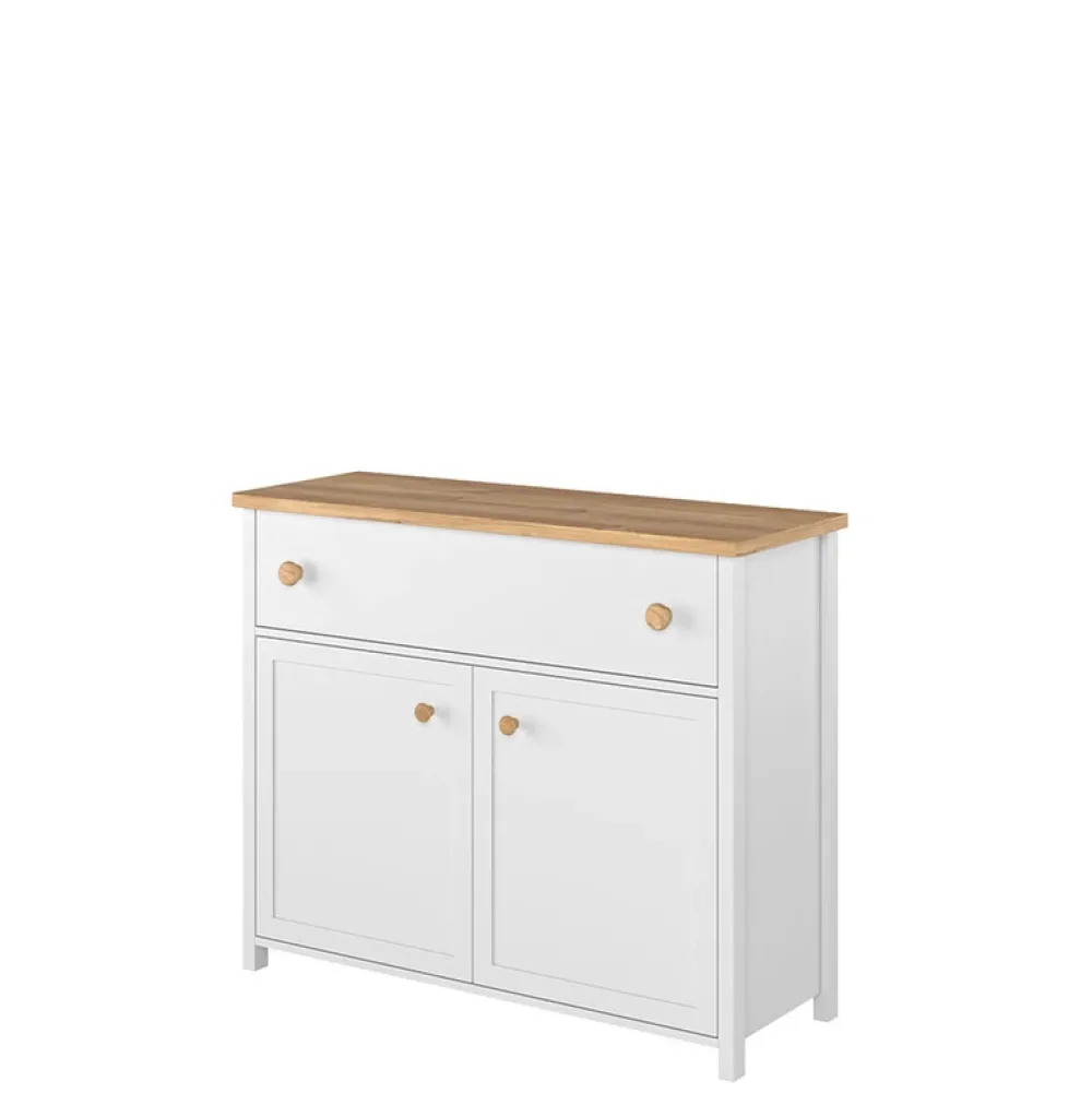 Na górze komody znajduje się szuflada osadzona na prowadnicach rolkowych, która zapewnia dodatkowe miejsce na przechowywanie różnych przedmiotów, takich jak bielizna czy koszulki. Pod szufladą znajdują się drzwi na zawiasach puszkowych, a za nimi półka, która pozwala na przechowywanie większych przedmiotów, takich jak książki czy sprzęt elektroniczny oraz elementy garderoby.