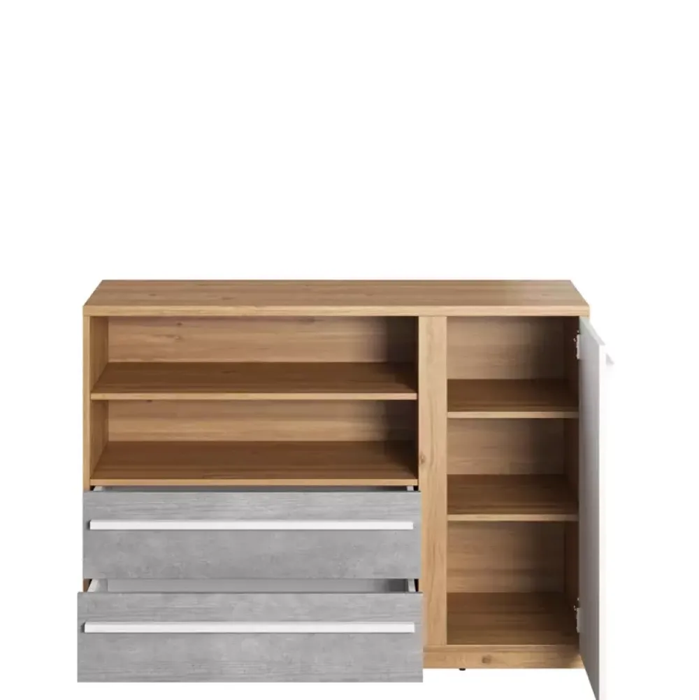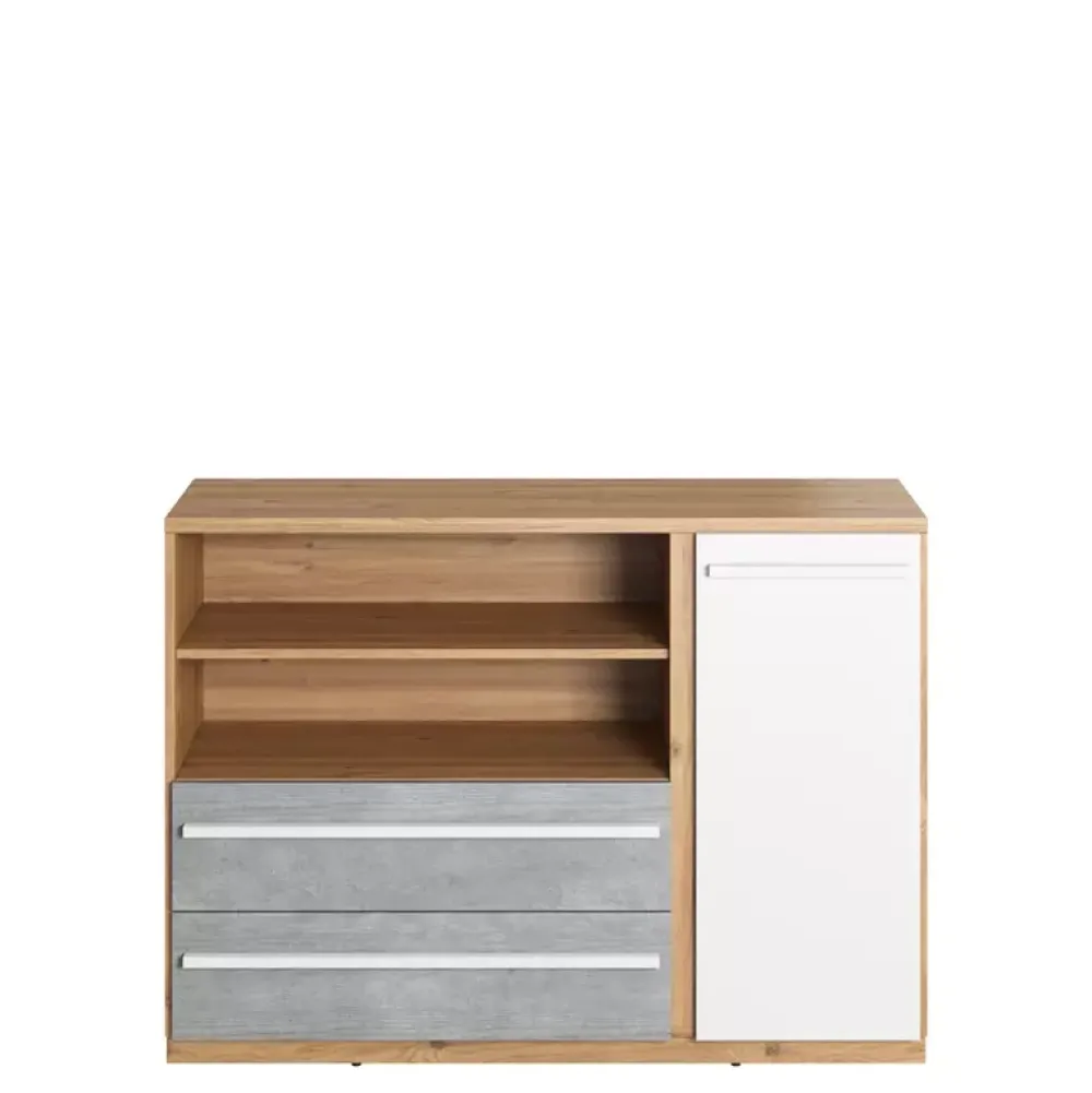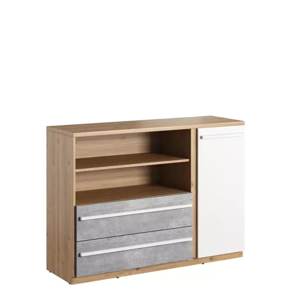 Komoda młodzieżowa wyposażona jest w drzwi, za którymi znajdują się dwie półki, idealne do przechowywania książek, podręczników lub innych akcesoriów. Ponadto, dwa otwarte poziomy umożliwiają łatwe przechowywanie dekoracji, kosmetyków czy innych drobiazgów. Dwie pojemne szuflady osadzone na prowadnicach kulkowych to kolejny atut tej komody – pozwolą na uporządkowanie ubrań lub innych potrzebnych rzeczy.