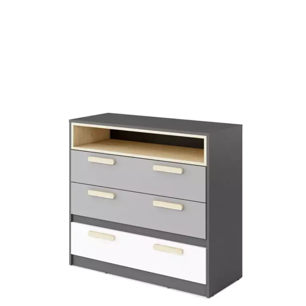 Nowoczesna stylistyka komody z pewnością przyciągnie uwagę młodzieży, którzy cenią sobie estetykę. Komoda jest wykonana z dbałością o detale, co daje wrażenie solidnego i eleganckiego mebla. Wnęka, którą posiada, to świetne rozwiązanie na przechowywanie mniejszych przedmiotów oraz dekorów. Obrzeża zabezpieczone okleiną ABS chronią komodę przed uszkodzeniami i zapewniają długowieczność mebla.