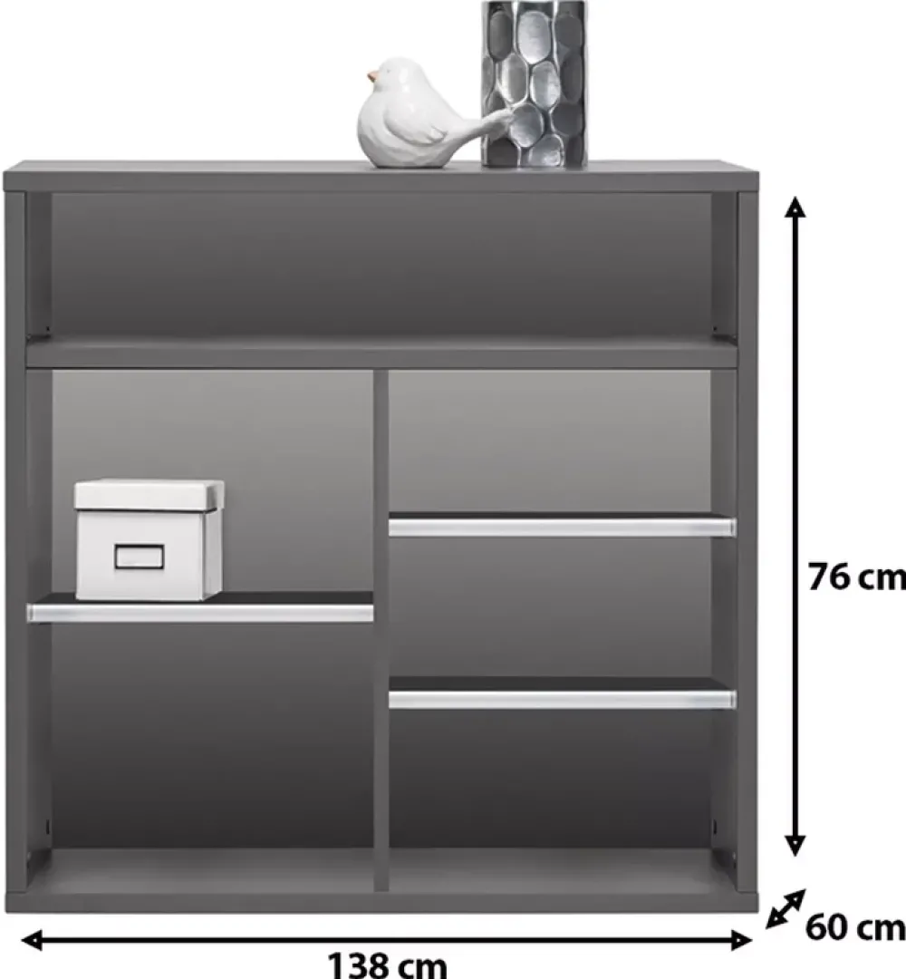 Pod szufladą znajdują się drzwi, za którymi skrywają się trzy przestronne półki. Te półki są idealne do przechowywania większych przedmiotów, takich jak gry, pudełka na buty czy plecaki. Każda z nich została zaprojektowana z myślą o optymalnym wykorzystaniu przestrzeni, pozwalając na uporządkowanie wszystkich najpotrzebniejszych rzeczy.