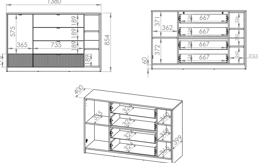 Po prawej stronie komody znajdują się trzy otwarte półki, które są idealnym miejscem na wyeksponowanie książek, dekoracji czy innych osobistych przedmiotów. Dzięki nim łatwo zorganizujesz przestrzeń w pokoju, nadając wnętrzu indywidualny charakter. To także świetna przestrzeń na ulubione akcesoria, które chcesz mieć zawsze w zasięgu ręki.