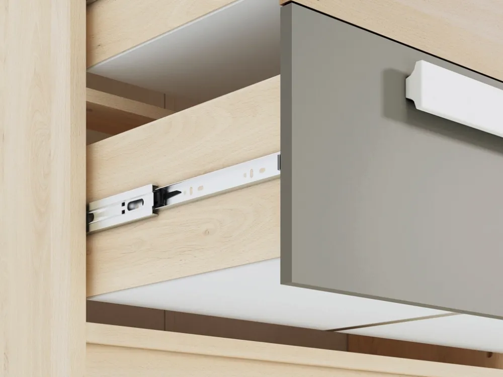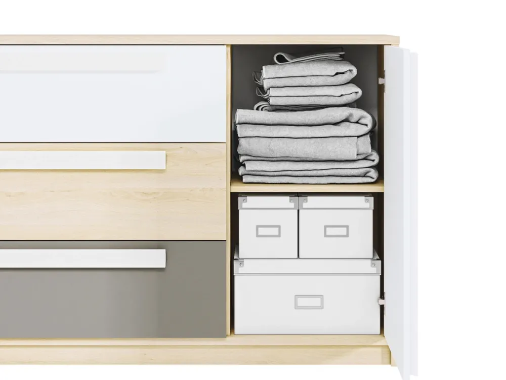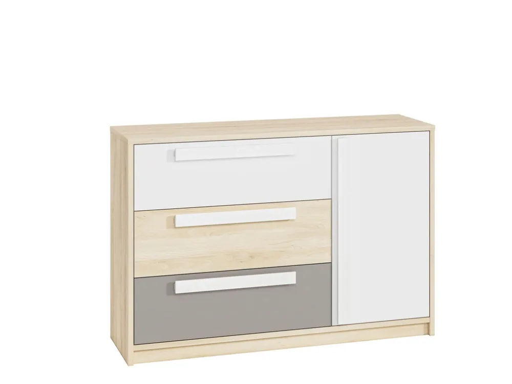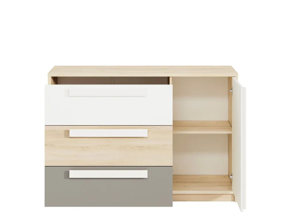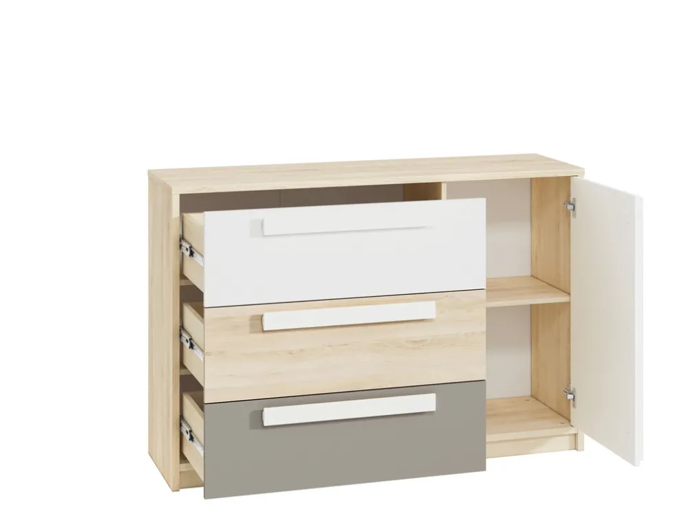 Komoda wyposażona jest w trzy pojemne szuflady na prowadnicach kulkowych, które zapewniają płynne i bezproblemowe wysuwanie. To idealne miejsce na przechowywanie ubrań, książek, zabawek czy innych drobiazgów, które zawsze będą na swoim miejscu.