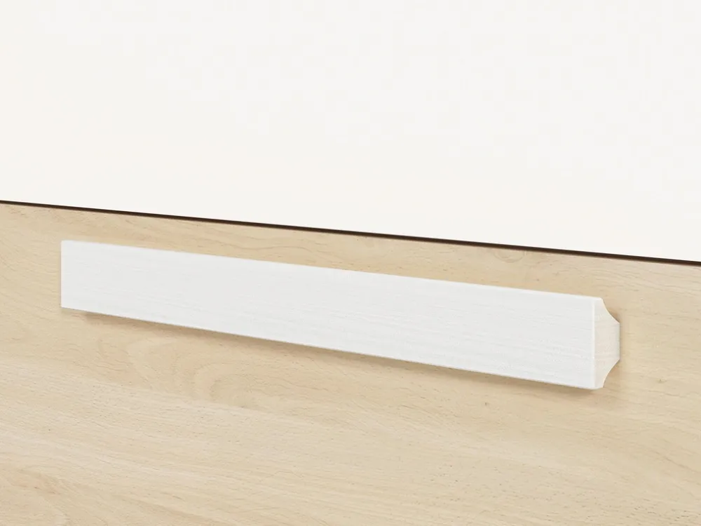 Szczególną uwagę przyciągają stylowe uchwyty wykonane z drewna w kolorze białym. Ich klasyczny design i staranne wykończenie dodają komodzie elegancji i harmonijnie komponują się z każdym wnętrzem. To małe, ale niezwykle istotne detale, które wyróżniają ten mebel na tle innych.