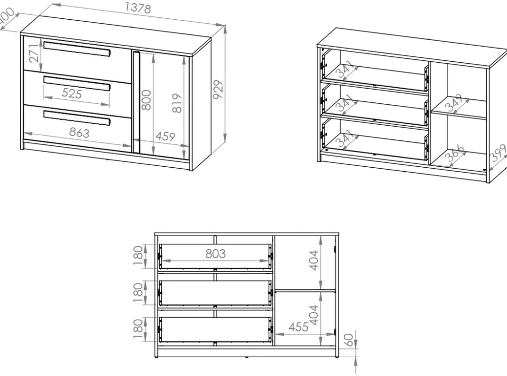 - Komoda została wyposażona w trzy pojemne szuflady, które poruszają się na prowadnicach kulkowych.