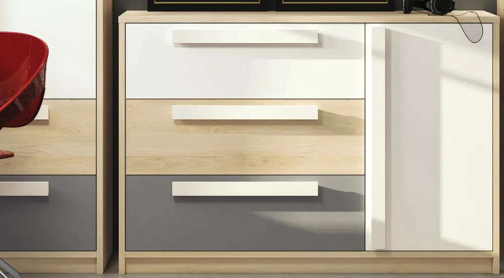 Poznaj elegancką komodę DROP, która idealnie wpasuje się w pokój każdego młodzieńca. Jej solidny korpus został wykonany z wysokiej jakości płyty laminowanej o imponującej grubości 22 mm. Taka konstrukcja zapewnia nie tylko trwałość, ale także odporność na codzienne użytkowanie i drobne uszkodzenia. Twoje dziecko będzie mogło cieszyć się nią przez długie lata.