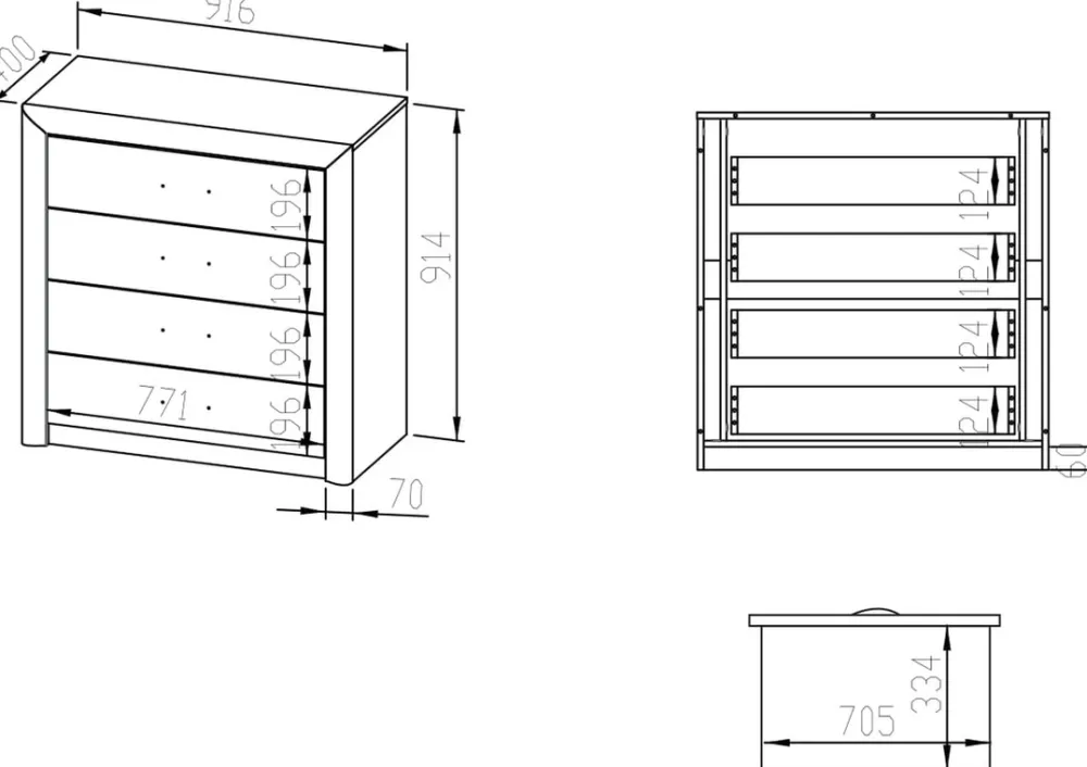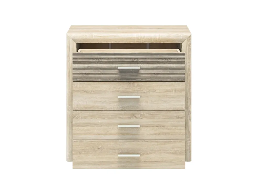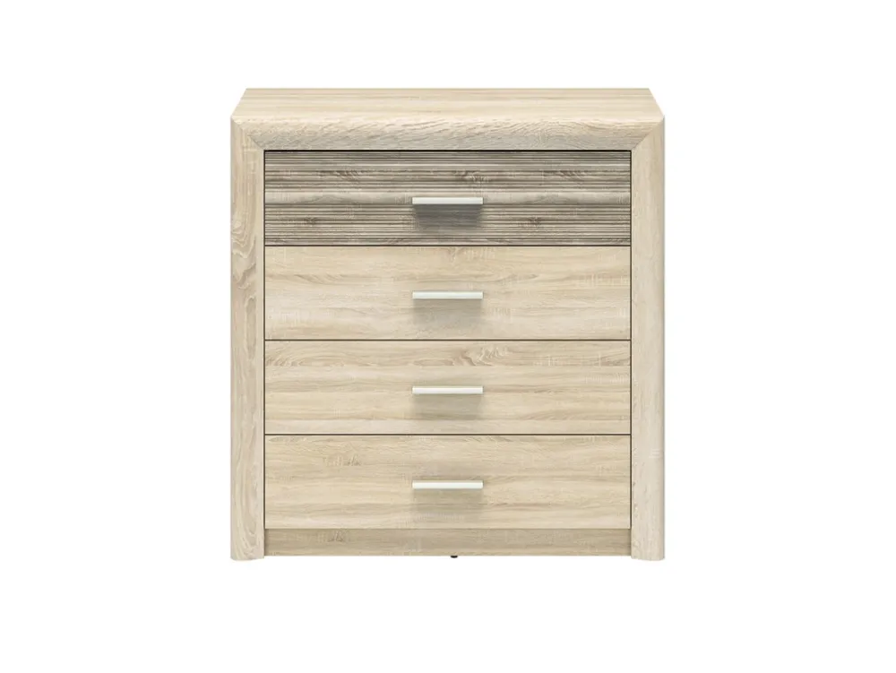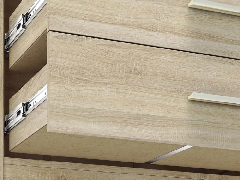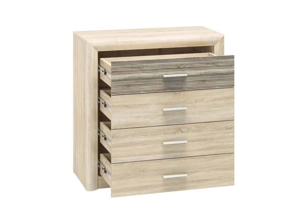 Komoda wyposażona jest w cztery pojemne szuflady, które zapewniają mnóstwo miejsca na przechowywanie odzieży, dokumentów czy innych niezbędnych przedmiotów. Każda szuflada osadzona jest na solidnych prowadnicach kulkowych, co gwarantuje płynne i ciche otwieranie, nawet przy większym obciążeniu. Dzięki temu wszystkie Twoje rzeczy będą zawsze uporządkowane i łatwo dostępne.