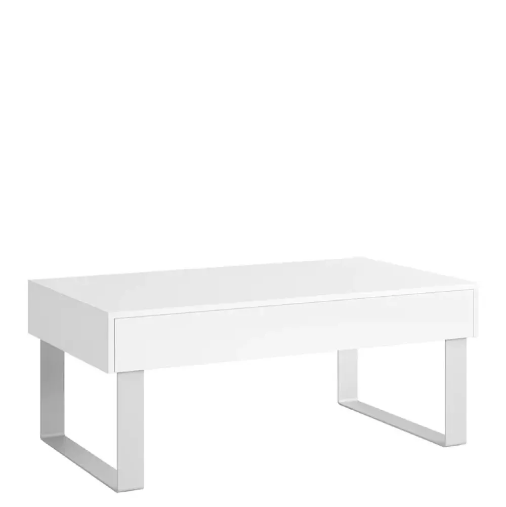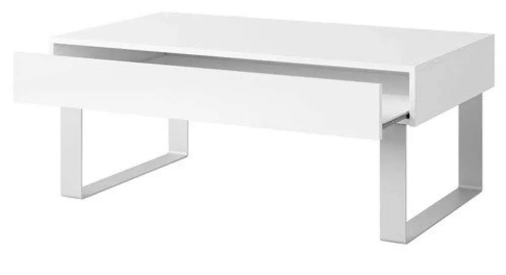 - Stolik kawowy o szerokości 110 cm posiada szufladę. Ława wykonana z wysokiej jakości materiałów sprawdzi się w salonie jak i pokoju młodzieżowym. Kolor biały połysk