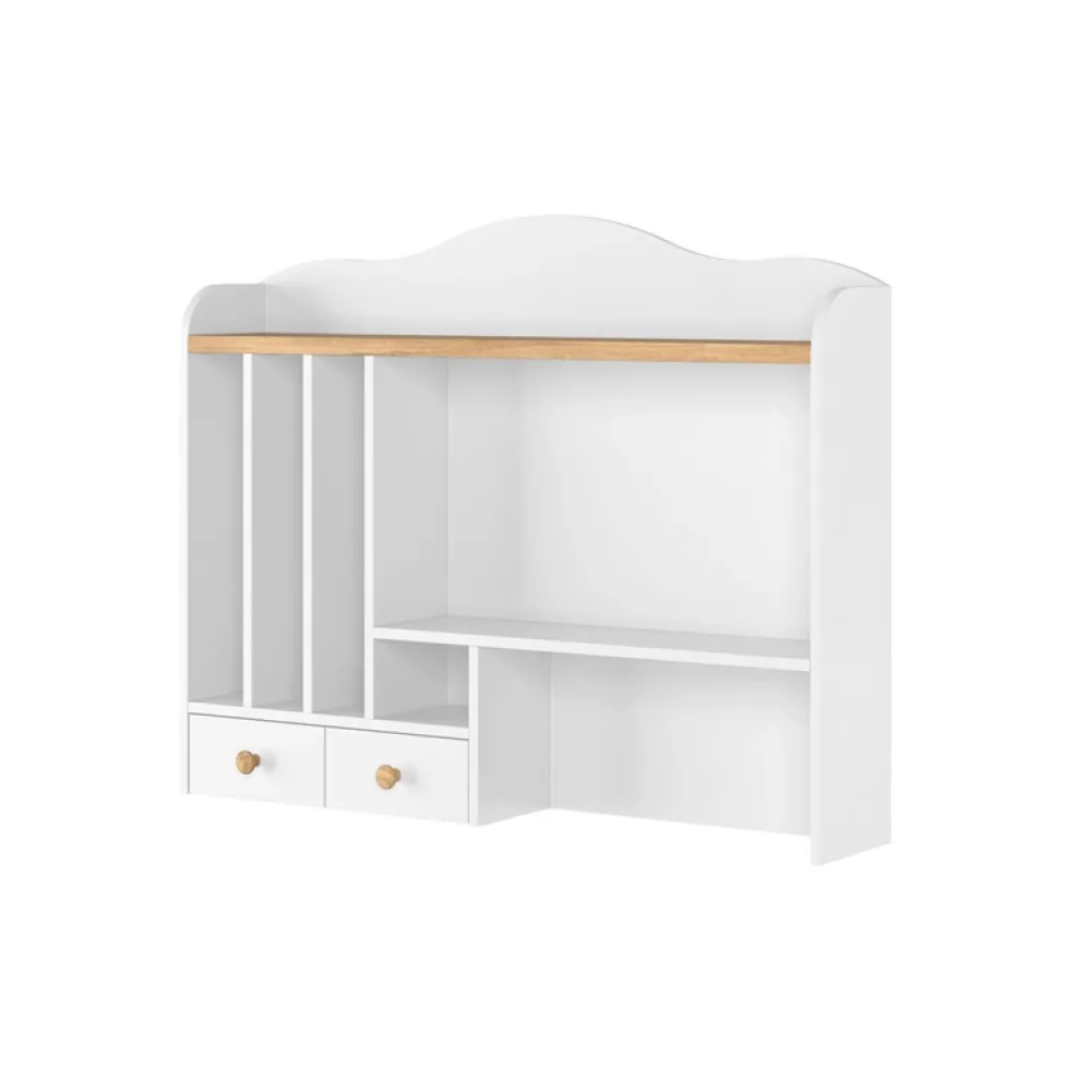 - Nadstawka na biurko STORY została wykonana w kolorze bieli alpejskiej z akcentami w wybarwieniu dąb nash. Nadstawka posiada liczne poziomy oraz przegrody pozwalające na wiele możliwości jej aranżacji oraz dwie szuflady z prowadnicami rolkowymi.