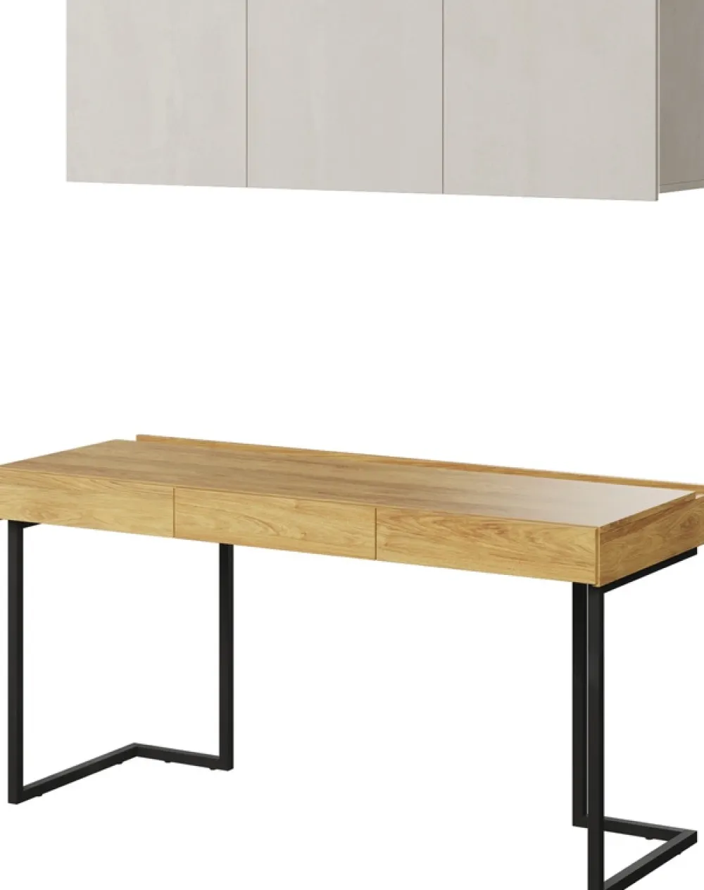 To biurko charakteryzuje się prostą, aczkolwiek elegancką formą. Blat w ciepłym odcieniu drewna, wsparty na solidnych, metalowych nogach w czarnym kolorze, tworzy wyważoną kompozycję, która wprowadza nowoczesny styl do każdego pokoju młodzieżowego. Biurko jest wyposażone w trzy praktyczne szuflady, które idealnie nadają się do przechowywania niezbędnych akcesoriów szkolnych, książek czy innych przedmiotów codziennego użytku.