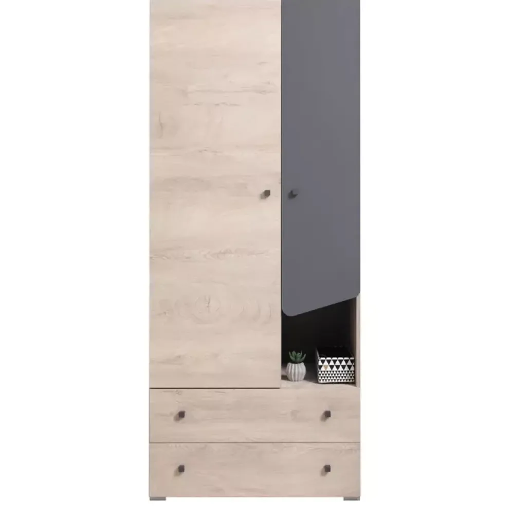 - Zestaw mebli młodzieżowych z kolekcji DAPHNE. Składa się z dwudrzwiowej szafy, dwóch regałów z szafkami i szufladami, biurka, pojemnej komody oraz dwupoziomowej półki wiszącej.
