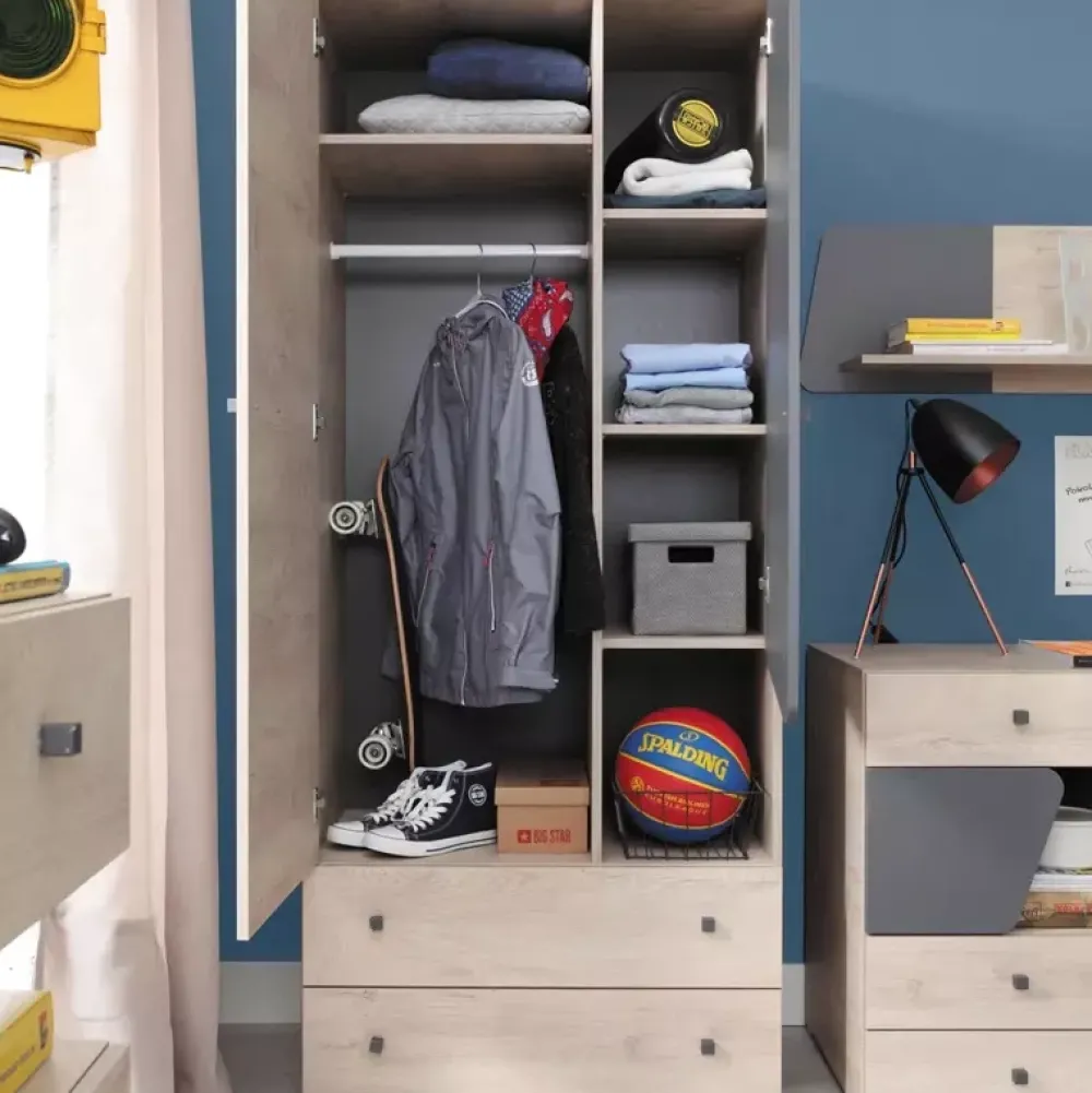 Meble młodzieżowe w bardzo rozsądnie skomponowanym zestawie, w skład którego wchodzi duża szafa dwudrzwiowa z szufladami, komoda z czterema pojemnymi szufladami, są także dwa wysokie regały z szufladami i szafkami, nie mogło rzecz jasna zabraknąć w nim biurka, które jest wyjątkowe z uwagi na dużą powierzchnię blatu roboczego o wymiarach 125 x 55cm.